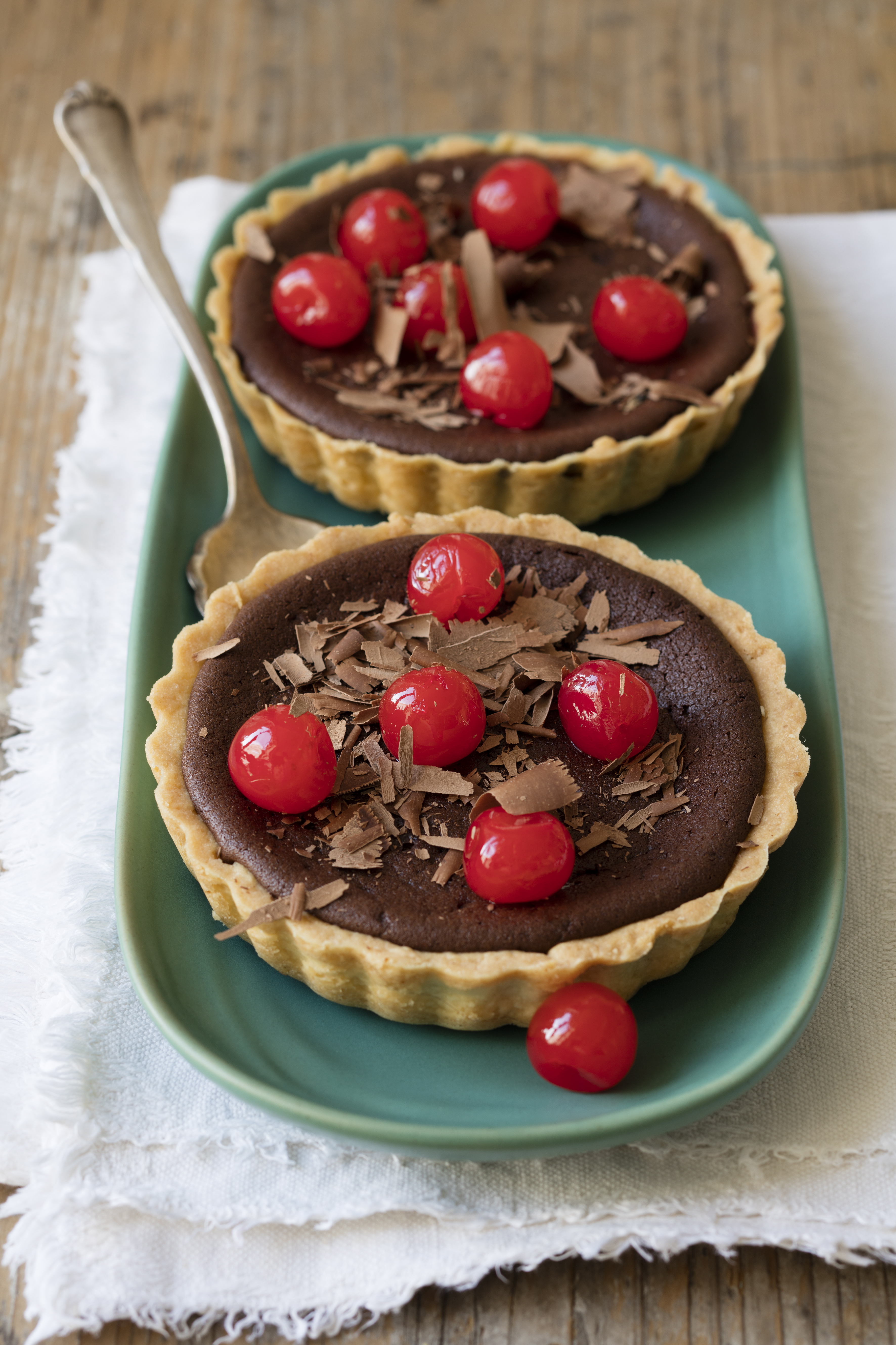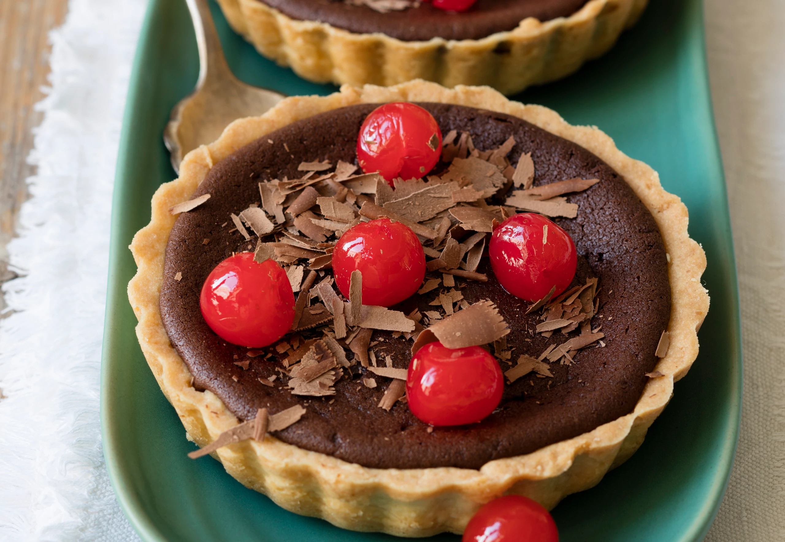 - Kirschen in ein Sieb leeren, gut abtropfen lassen und auf Küchenpapier trockentupfen. Schokotörtchen mit Kirschen garnieren und mit gehobelter Kuvertüre bestreut servieren.