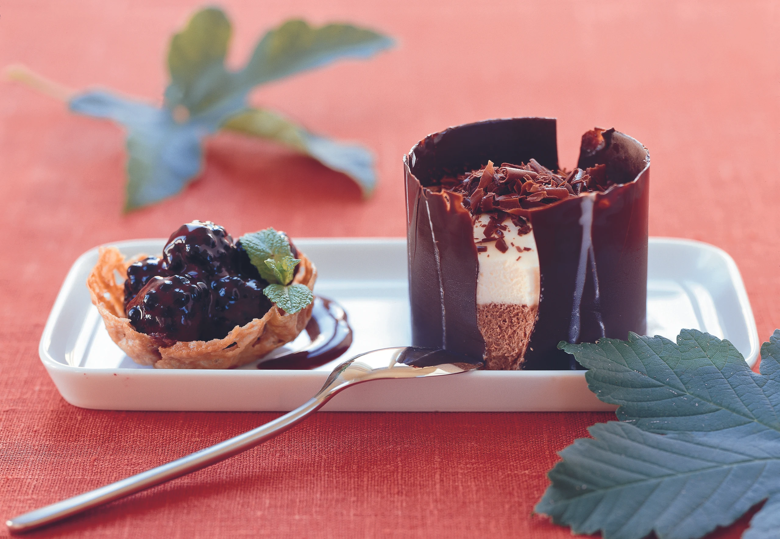 Für die Torten-Förmchen Streifen aus Backpapier zuschneiden (je 5 x 20 cm). Schokolade zerkleinern, in eine Schüssel geben und im Wasserbad (ca. 37 °C) schmelzen. Schokolade auf die Papierstreifen streichen, kurz fest werden lassen und zu einem Ring formen (Papier außen). Zum Festwerden kühlen (ca. 40 Minuten).