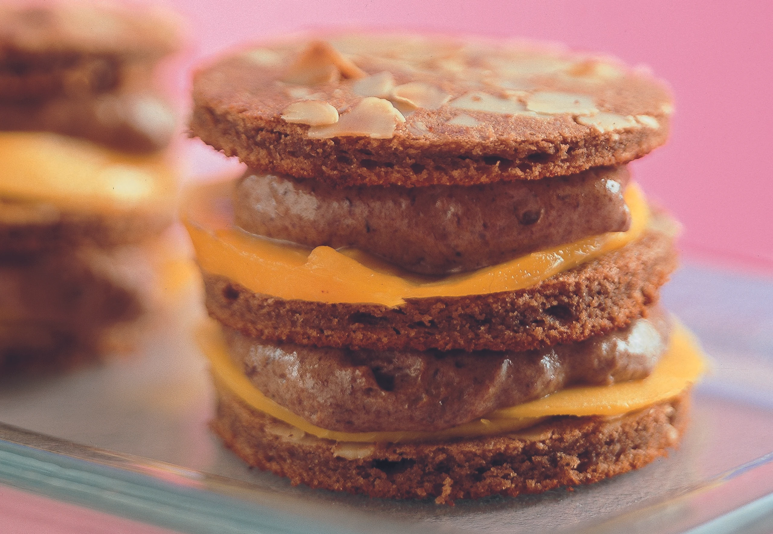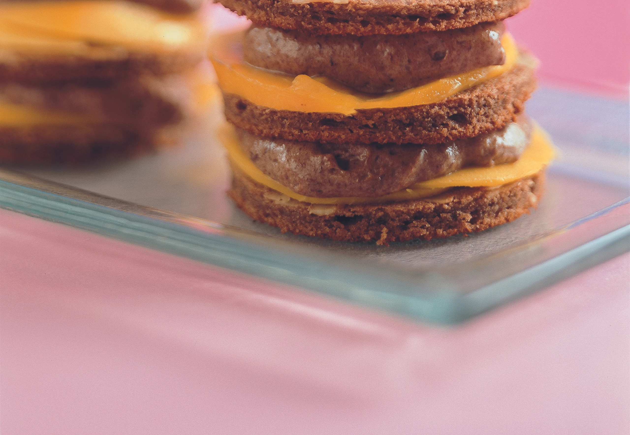 Mango schälen, Fruchtfleisch vom Kern und in dünne Scheiben schneiden. Creme in einen Dressiersack mit glatter Tülle füllen. Pro Türmchen zwei Schokoscheiben zuerst mit Mango belegen, Creme darauf dressieren, übereinander setzen und mit einer dritten Schokoscheibe bedecken. Sofort servieren.
