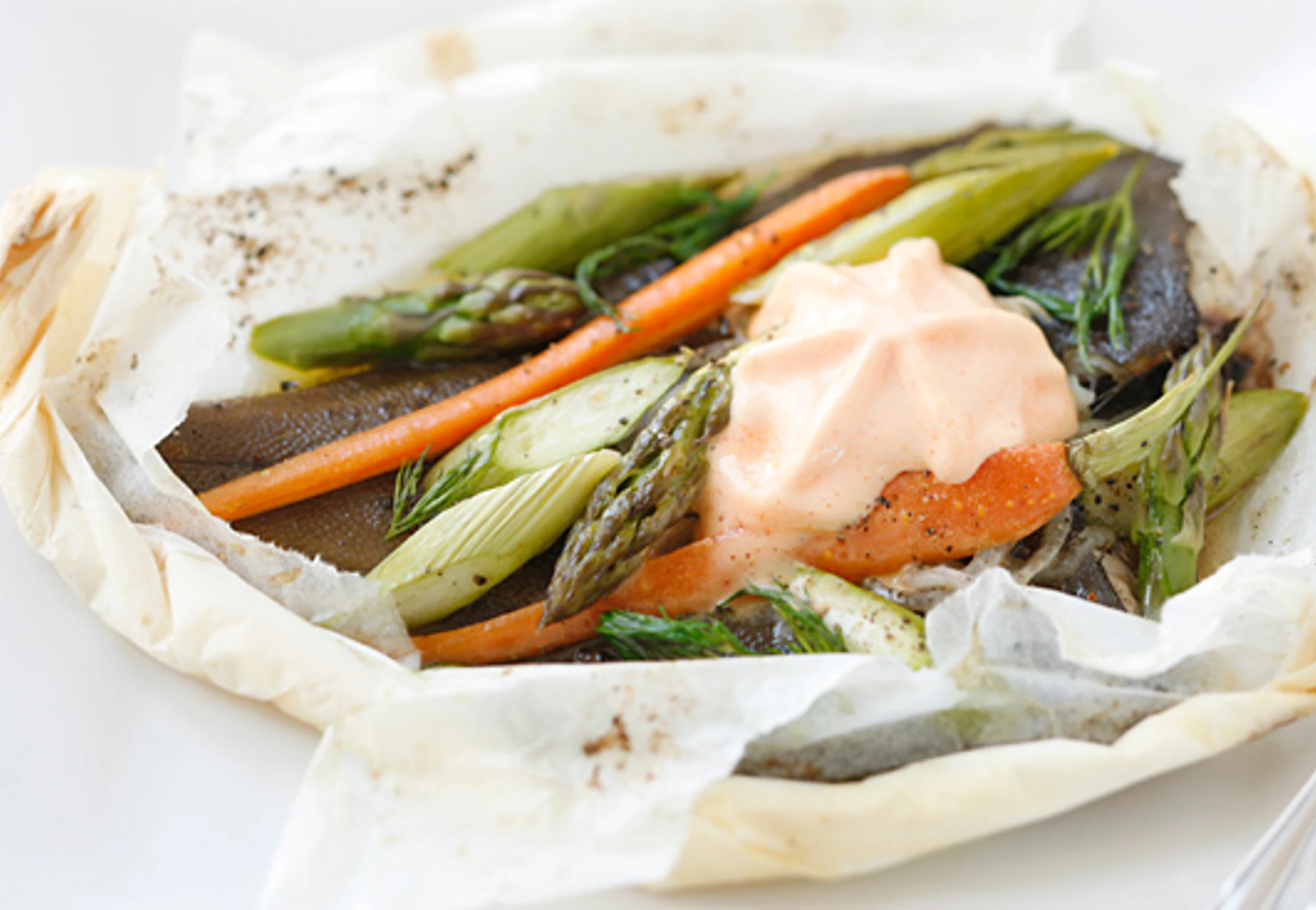- Päckchen auf das Backblech legen und im Rohr (untere Schiene) 20 Minuten garen. Fische mit Hollandaise servieren.