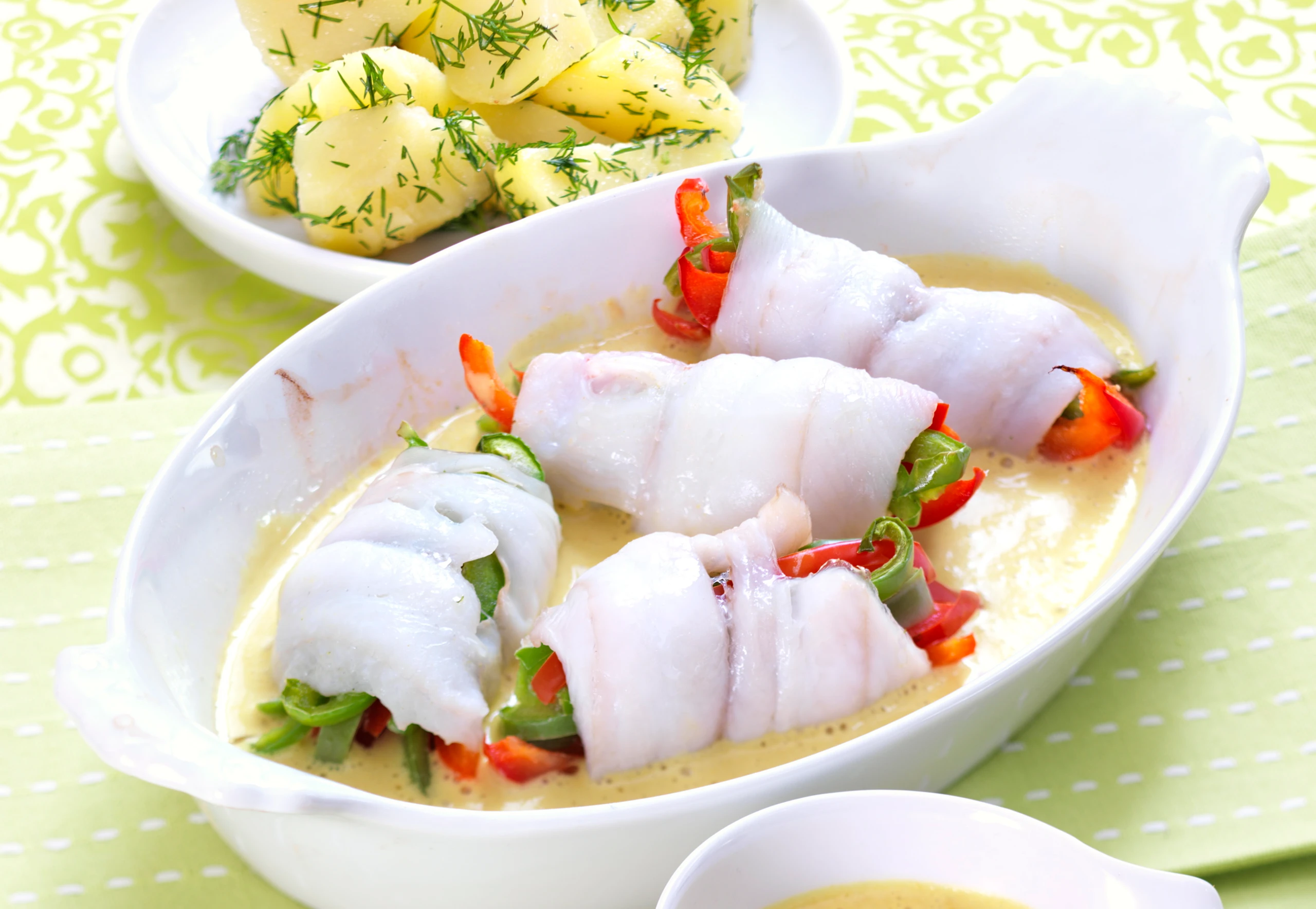 - Filets mit Salz, Pfeffer und Zitronensaft würzen, mit den Paprikastreifen belegen, einrollen und mit Zahnstochern fixieren. Röllchen in die Form legen, mit Wein untergießen und im Rohr (untere Schiene / Gitterrost) 20 Minuten garen.