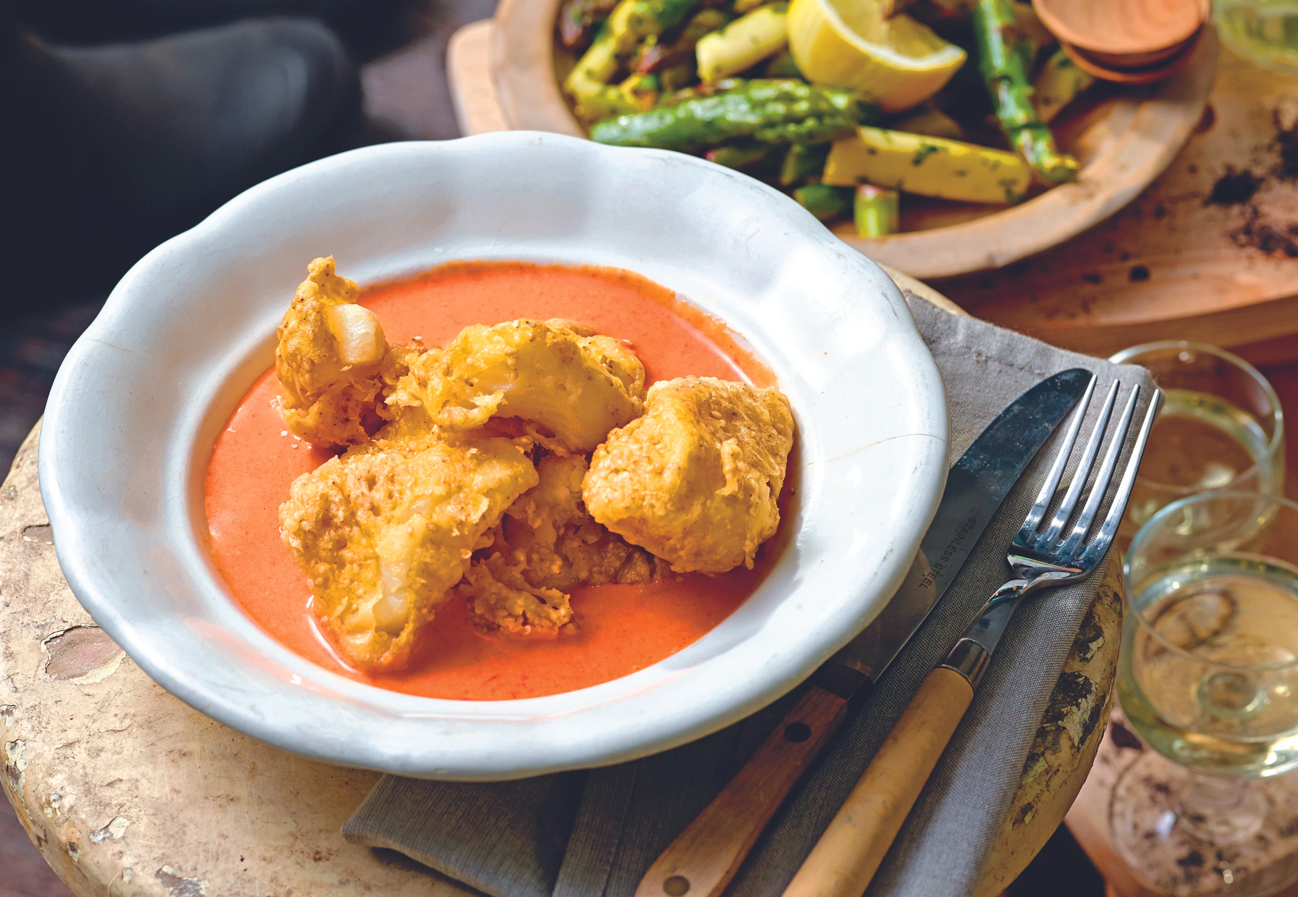 Scholle im Sesam-Weinteig mit Paprikasauce und grünem Spargel