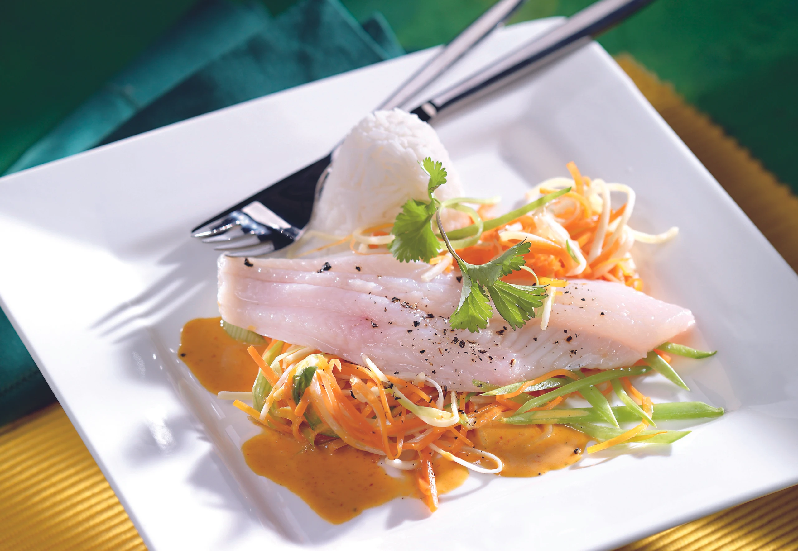 Gemüse und Filets warm stellen. Fond durch ein Sieb in einen kleinen Topf gießen, mit Currypaste und Kokosmilch verrühren, bei mittlerer Hitze ca. 5 Minuten einkochen.