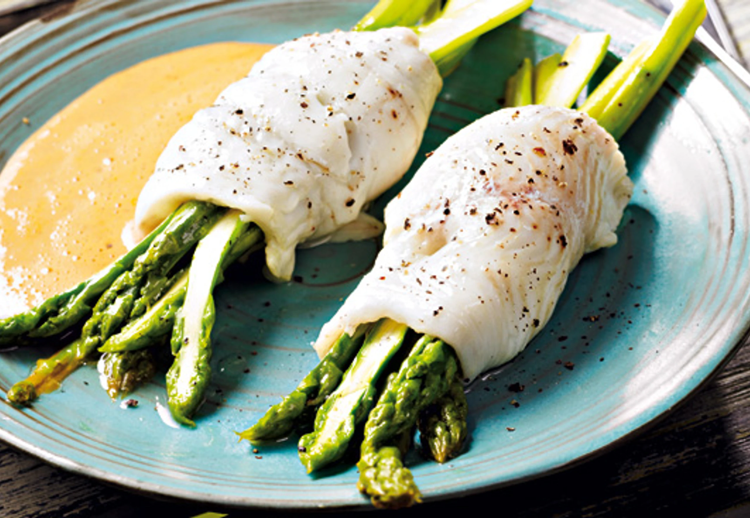 Filets mit Salz, Pfeffer und Zitronensaft würzen, am unteren Rand mit Spargel belegen und einrollen.