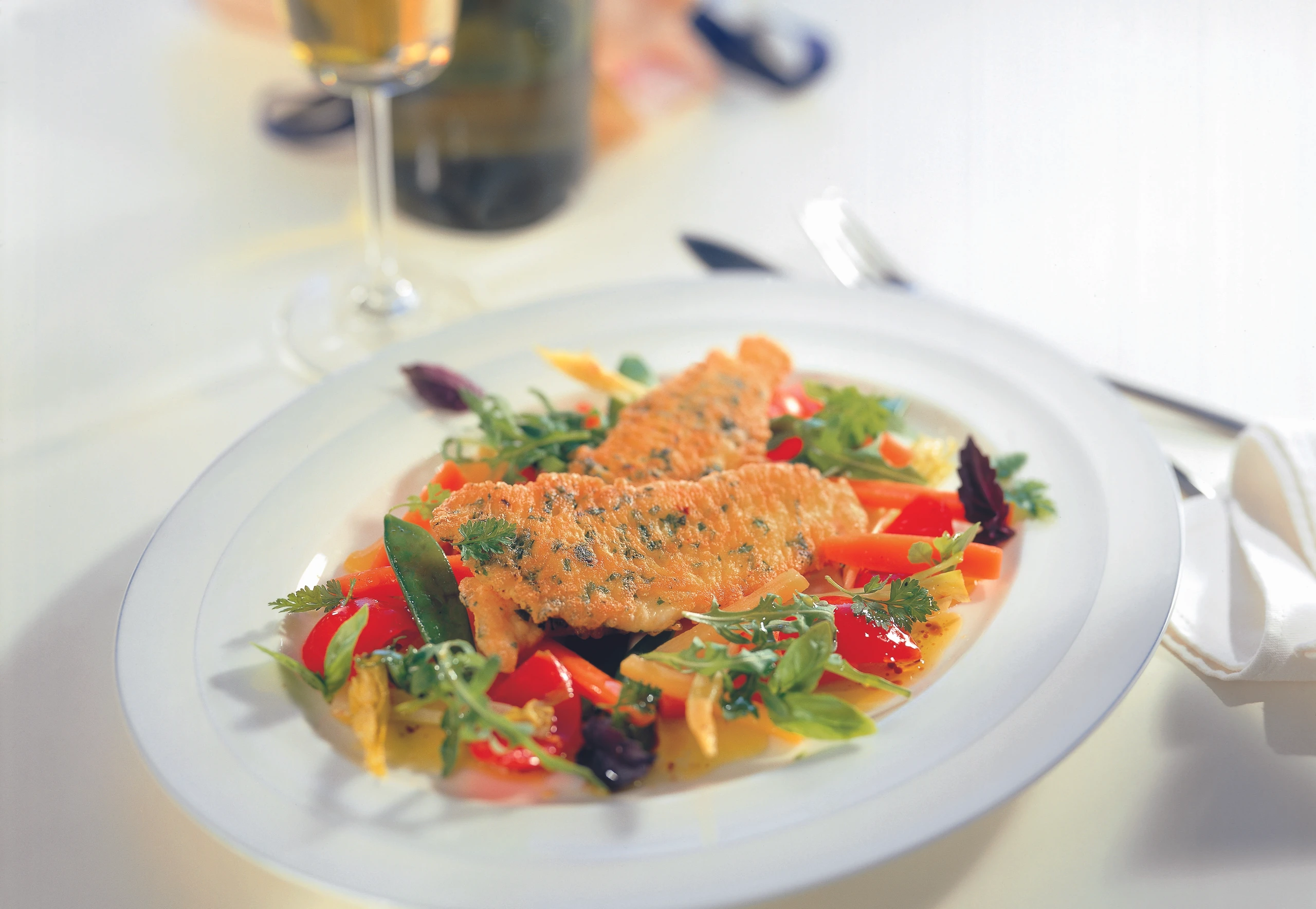 In einer großen, flachen Pfanne Öl erhitzen. Schollenfilets mit Salz, Pfeffer und Zitronensaft würzen. Filets in Mehl wenden, in die Ei-Kräutermischung tauchen, gut abtropfen lassen und im heißen Öl beidseitig (je ca. 2 Minuten) backen. Filets auf Küchenpapier abtropfen lassen. Gemüse und Schollenfilets mit Kräutern garniert servieren.
