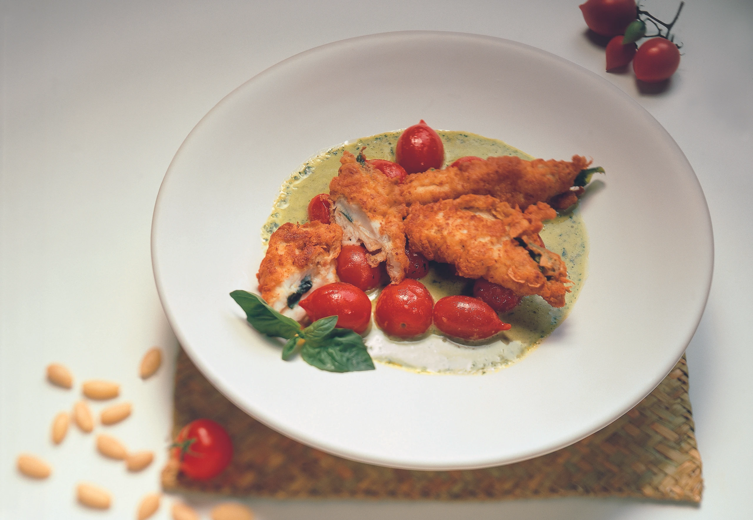 Schollenfilets in der Mandelhülle mit Basilikumsauce
