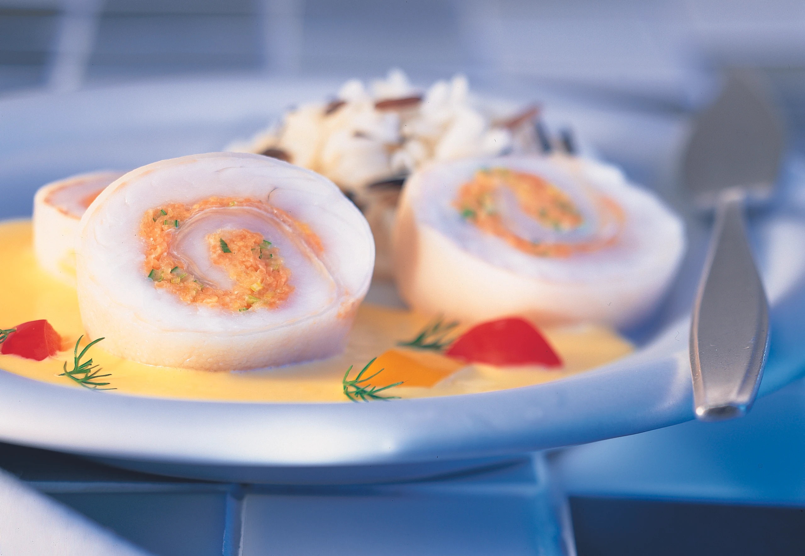 Schollenröllchen mit Gemüsefülle und Currysauce