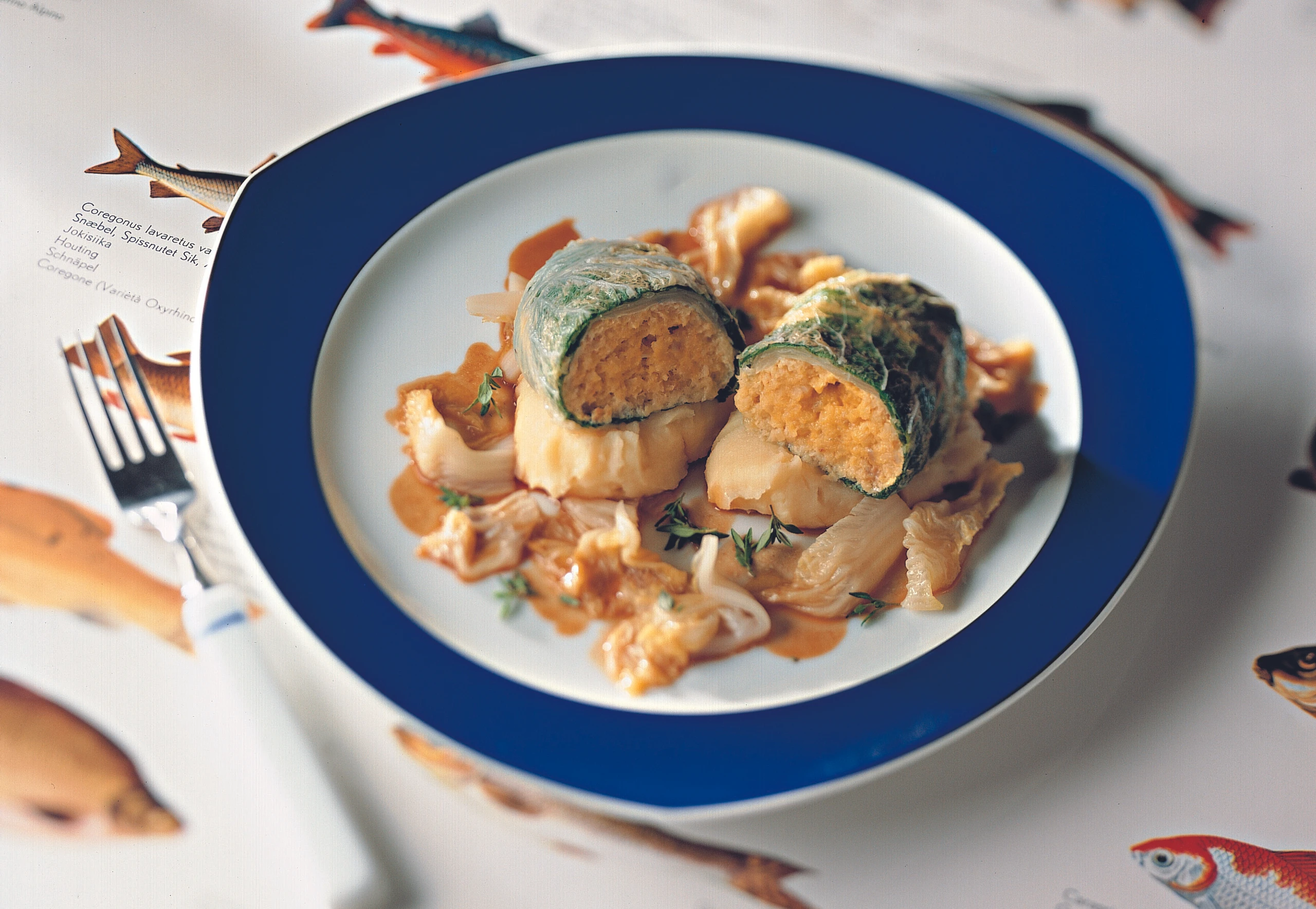 Eiklar cremig schlagen, Chinakohlbätter durchziehen und auflegen. Aus der Fischmasse vier Laibchen formen, jedes in einem Chinakohlblatt einschlagen.