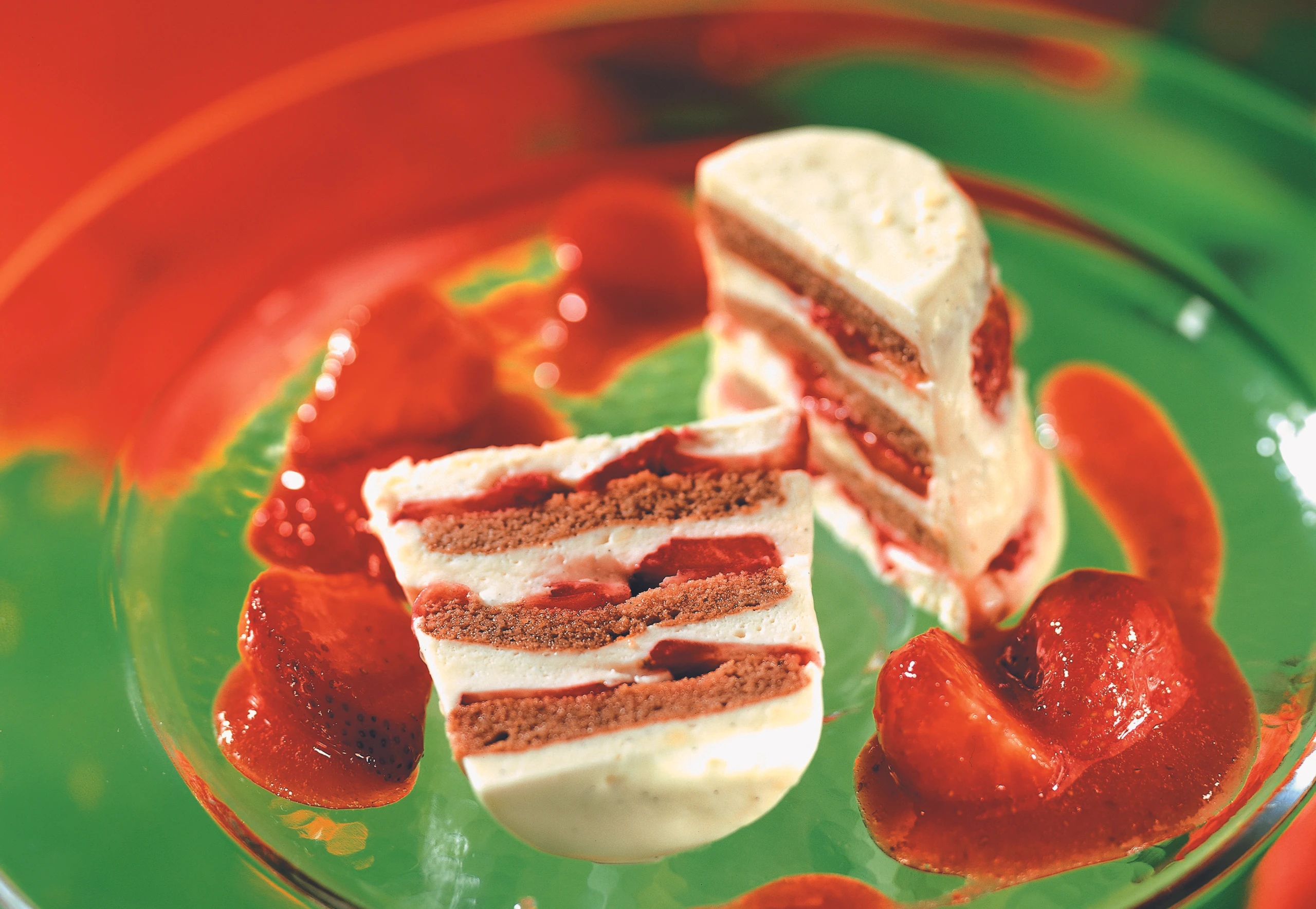 Förmchen ganz kurz in heißes Wasser tauchen, Törtchen auf Teller stürzen und mit Sauce und Erdbeerhälften garniert servieren.