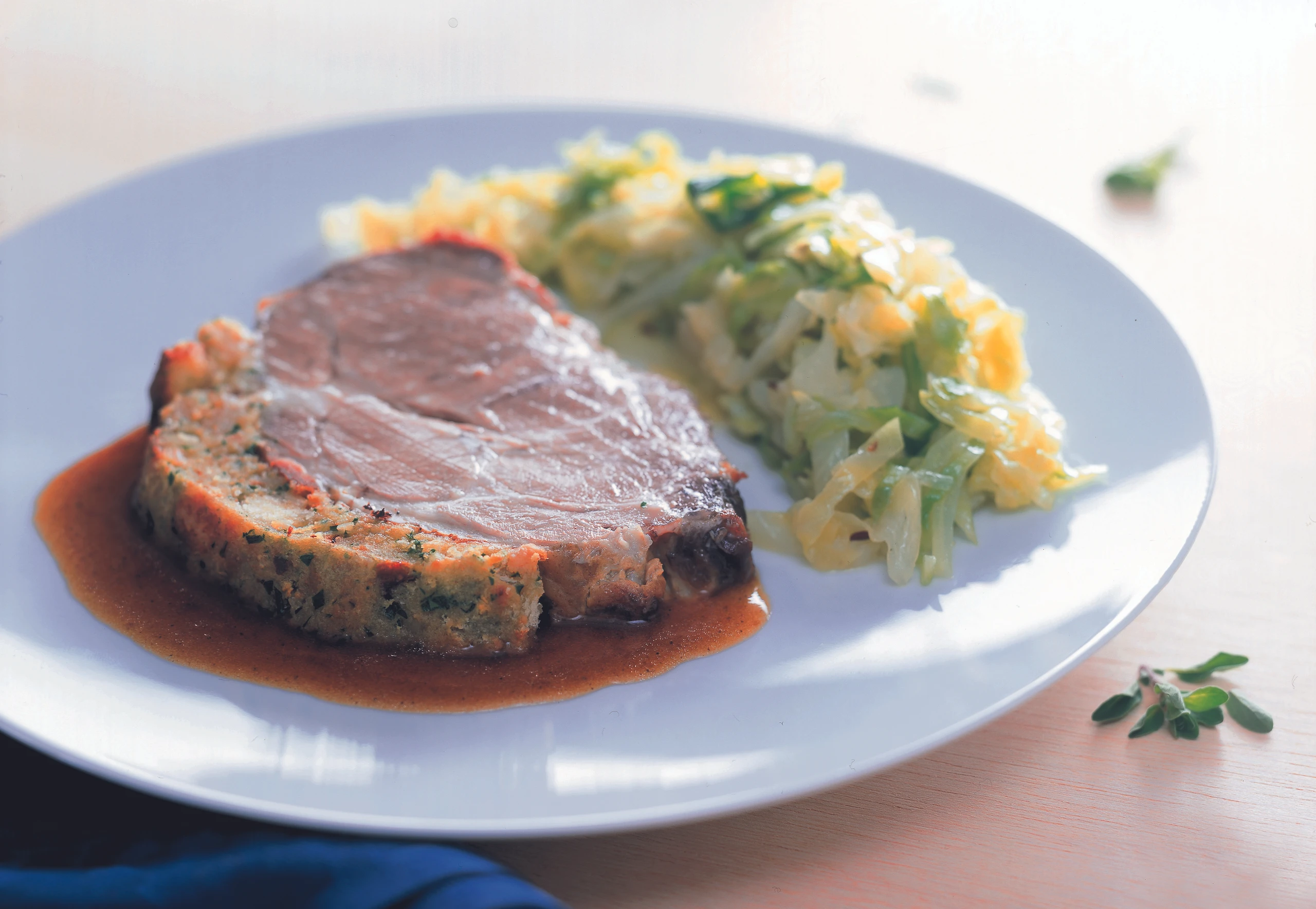 Schopfbraten mit Grammel-Brotkruste und Bierkraut