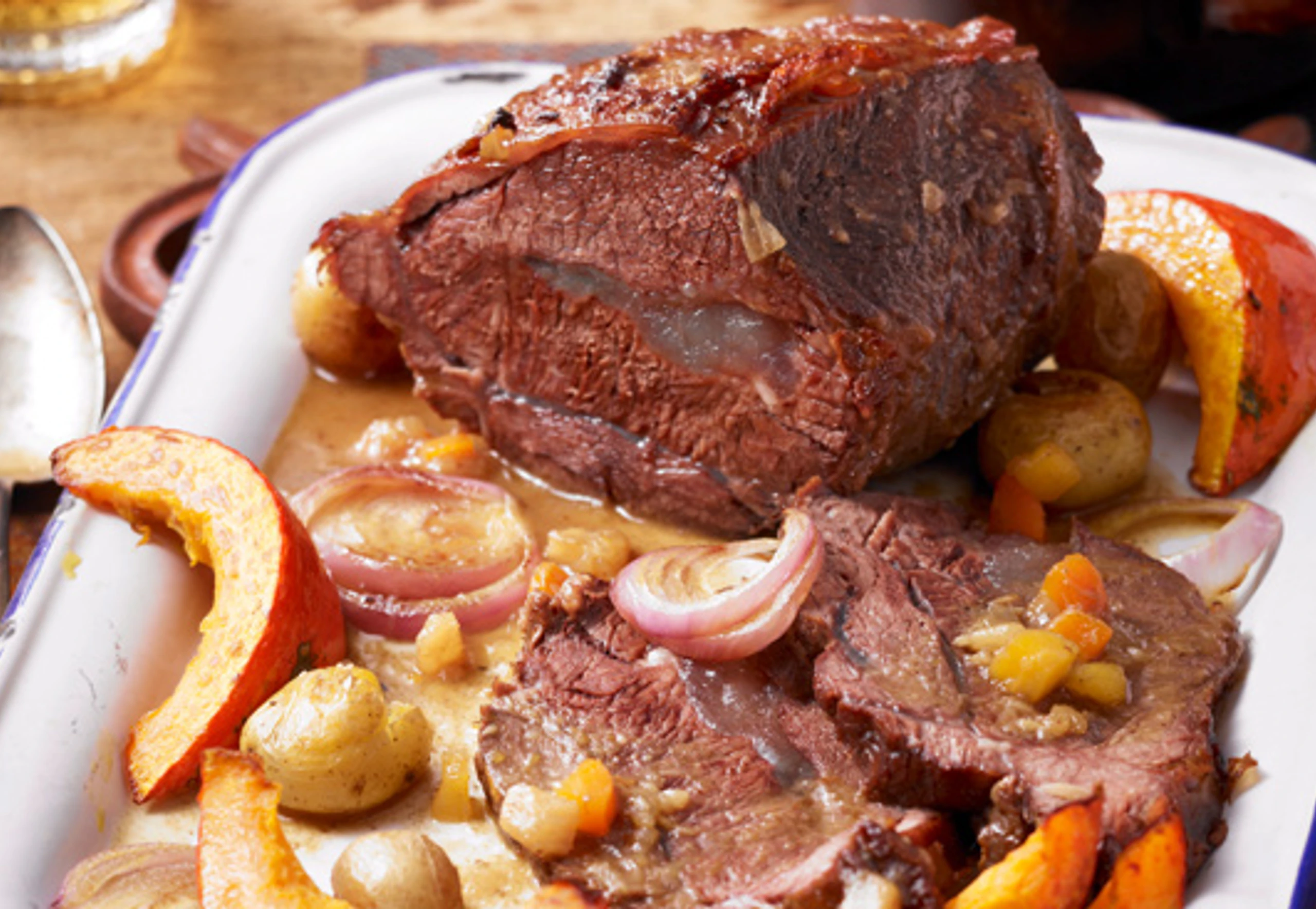 Fleisch aus dem Rohr nehmen und warm stellen. Rohrtemperatur auf 180°C erhöhen. Kürbis-Erdäpfelgemüse im Rohr (unter Schiene / Gitterrost) ca. 25 Minuten braten. Gegen Ende der Garzeit Fleisch zum Gemüse ins Rohr stellen und erhitzen. Fleisch portionieren, mit Sauce und Kürbis-Erdäpfelgemüse anrichten.