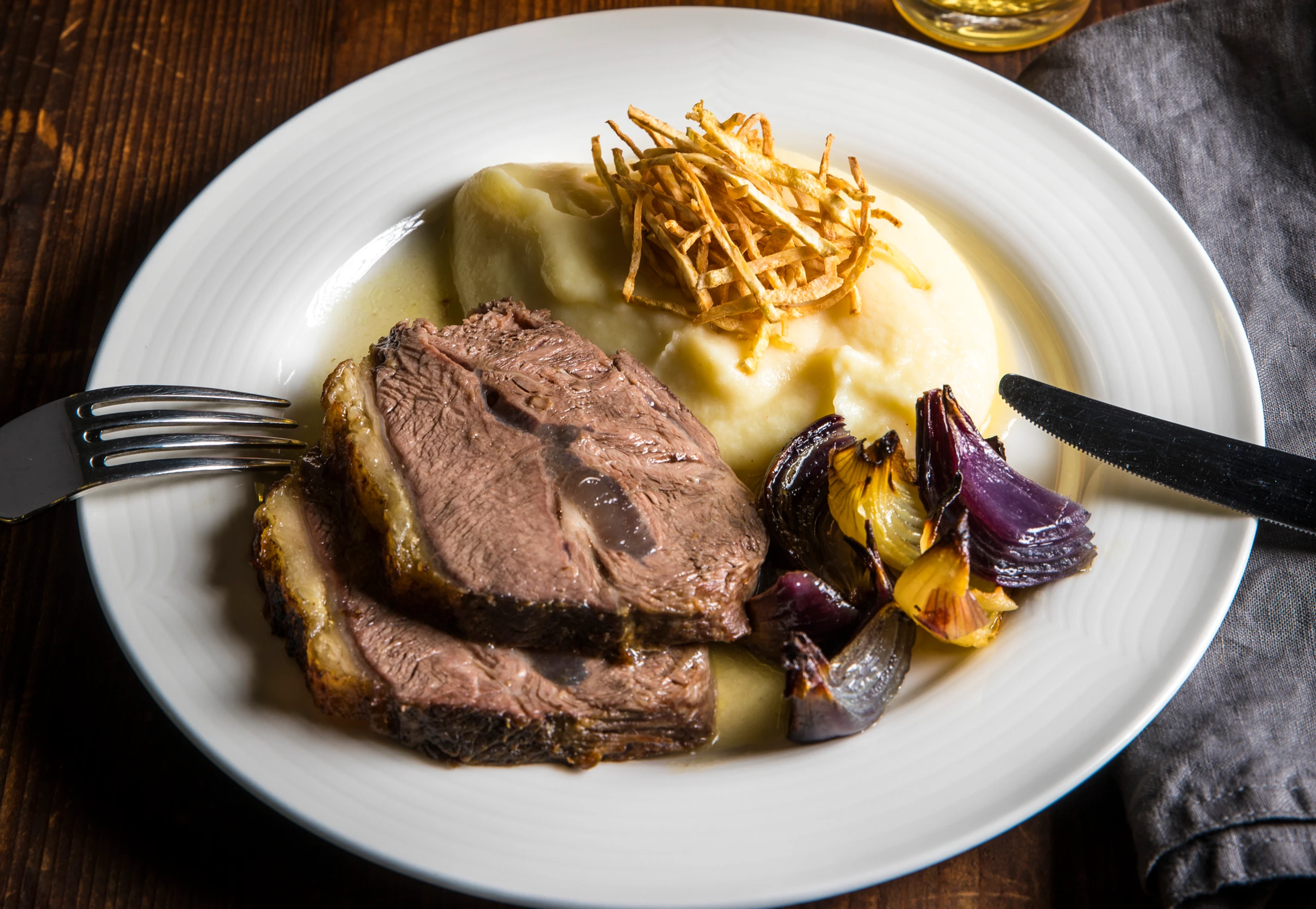Schulterscherzel mit Zwiebelsauce und Selleriepüree