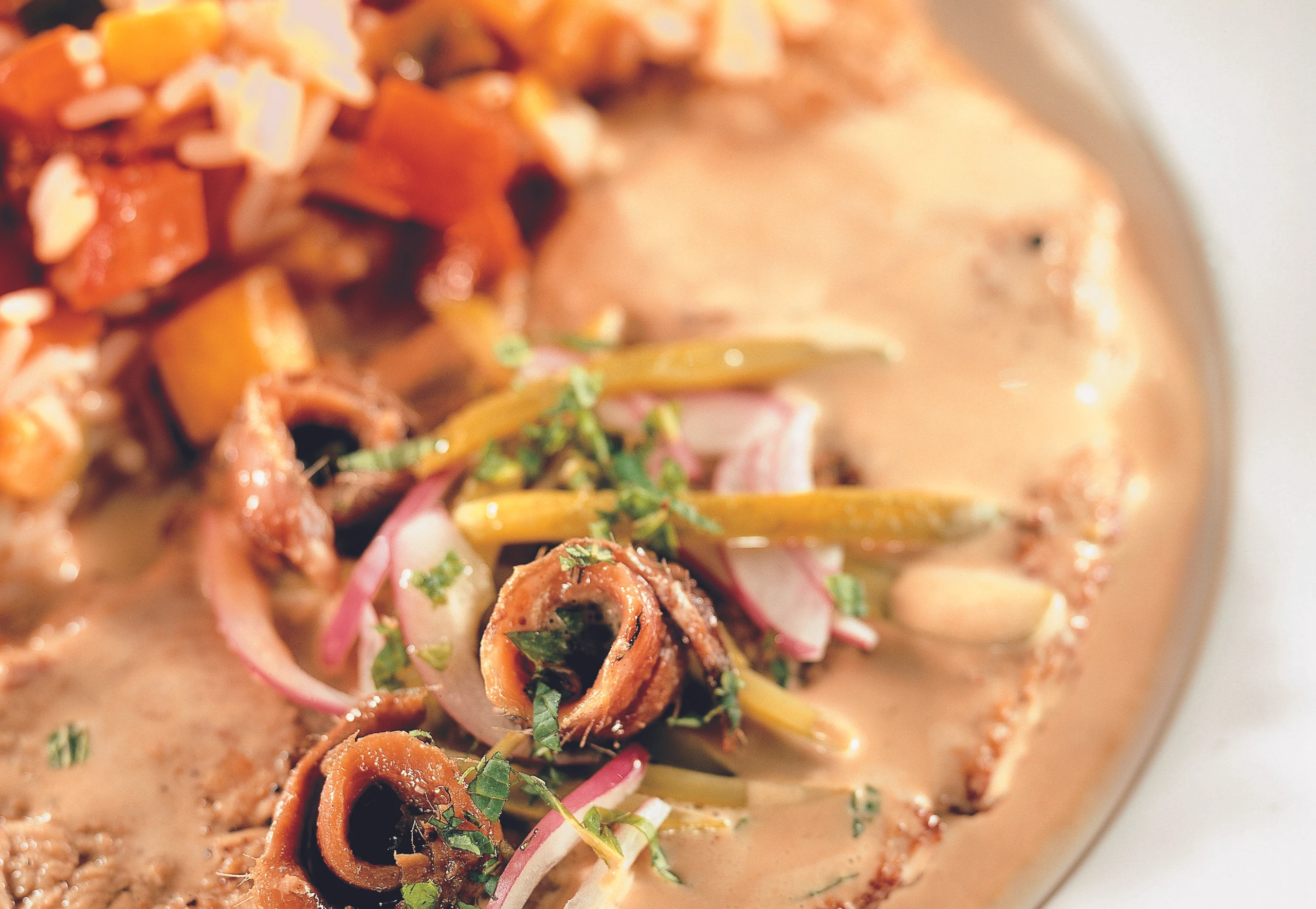 Während das Fleisch dünstet für die Garnitur Zwiebeln schälen und halbieren. Zwiebeln und Gurkerln in dünne Streifen schneiden. Sardellen grob hacken. In einem kleinen Topf Butter bis zum Aufschäumen erhitzen, Zwiebeln darin hell anschwitzen, Gurkerln, Sardellen, abgeriebene Zitronenschale und Petersil zugeben, kurz durchrösten und vom Herd nehmen.