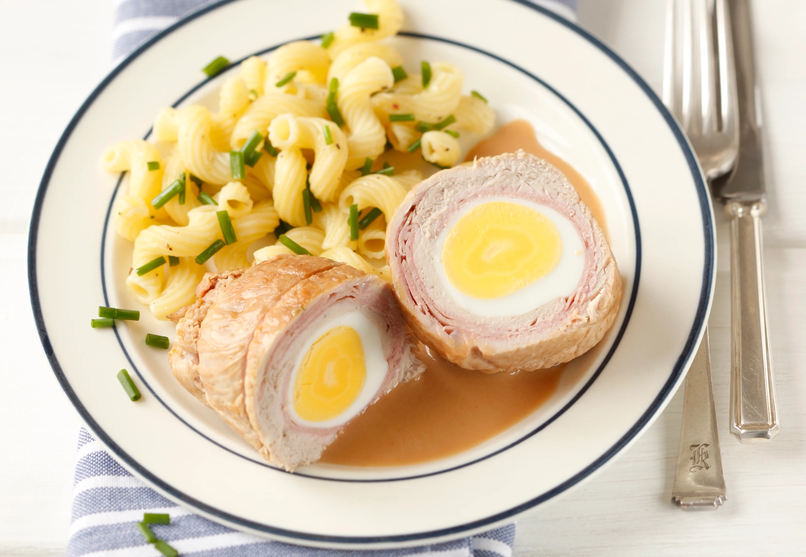 Fleisch behutsam klopfen, mit Salz und Pfeffer würzen und mit je einer Scheibe Schinken belegen. Eier auf den unteren Rand der Schnitzel legen. Seitliche Fleischränder einschlagen, Schnitzel über die Eier eng einrollen. Rouladen mit Spagat binden und würzen.