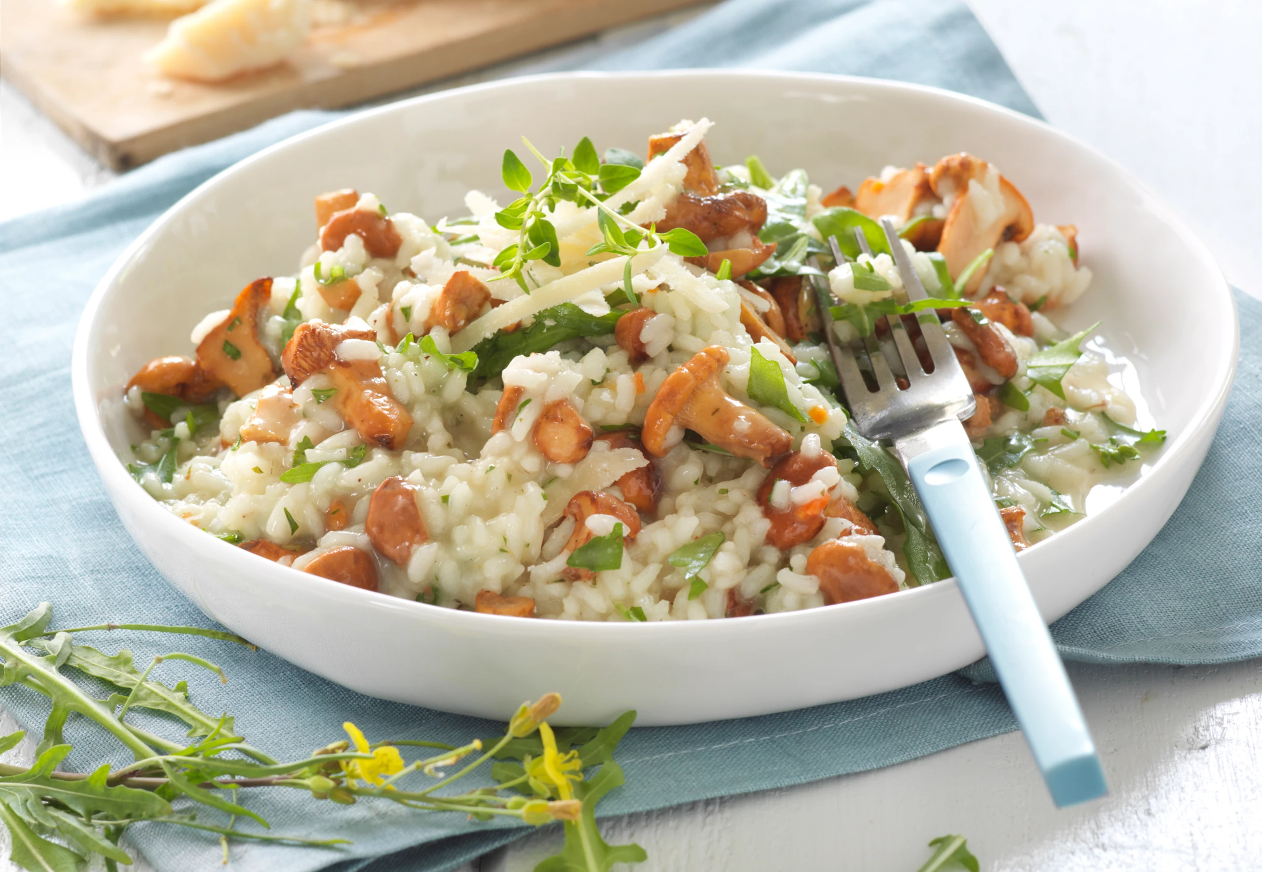 Knoblauch schälen und zerdrücken. Schwammerl im restlichen Öl anbraten, mit Salz, Pfeffer, Thymian und Knoblauch würzen. Schwammerl und Rucola unter den Reis mischen. Risotto mit übrigem Parmesan bestreut servieren.