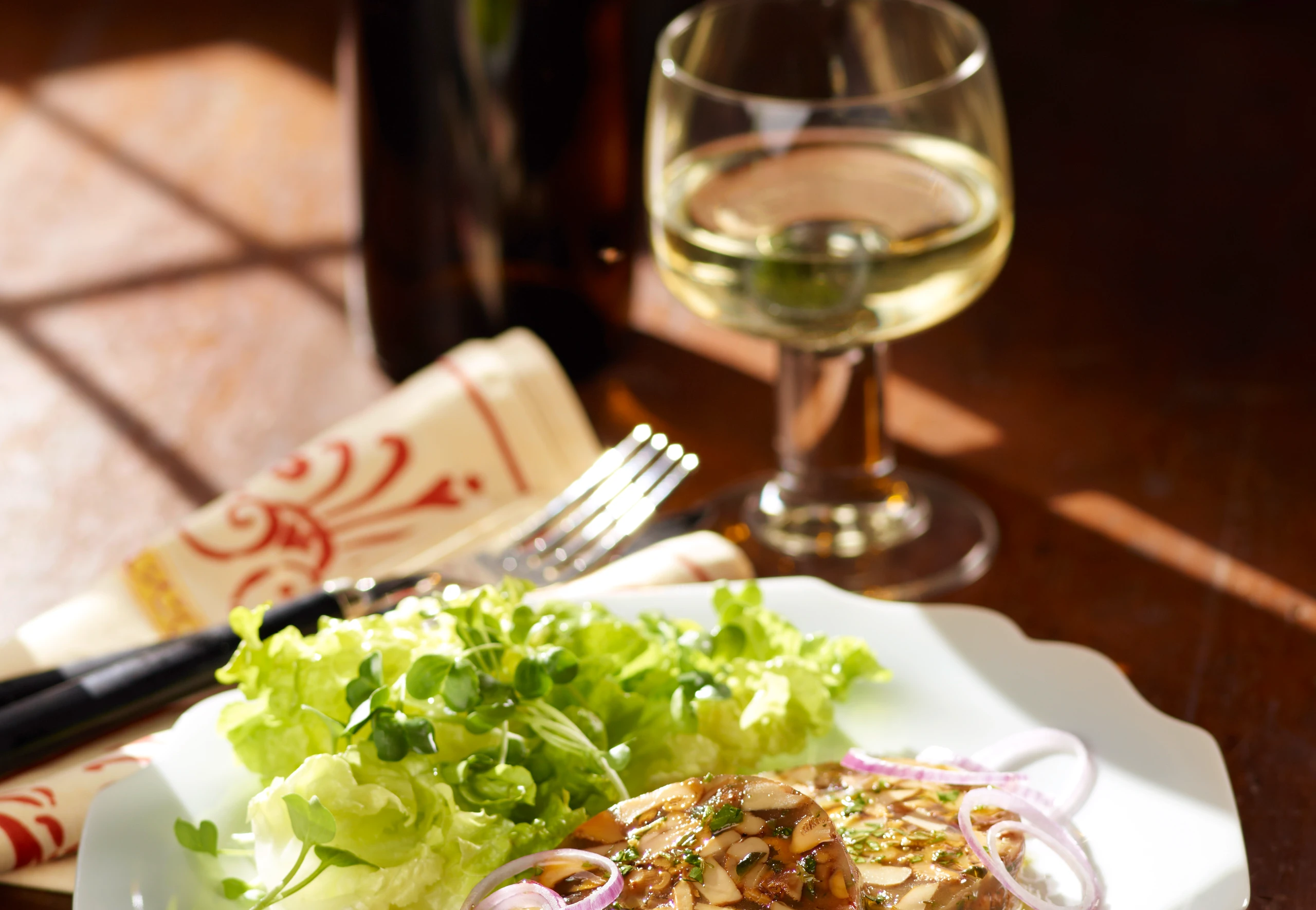 - Sulz stürzen, in Scheiben schneiden, mit der Marinade servieren, eventuell mit Salat und Kresse garnieren.