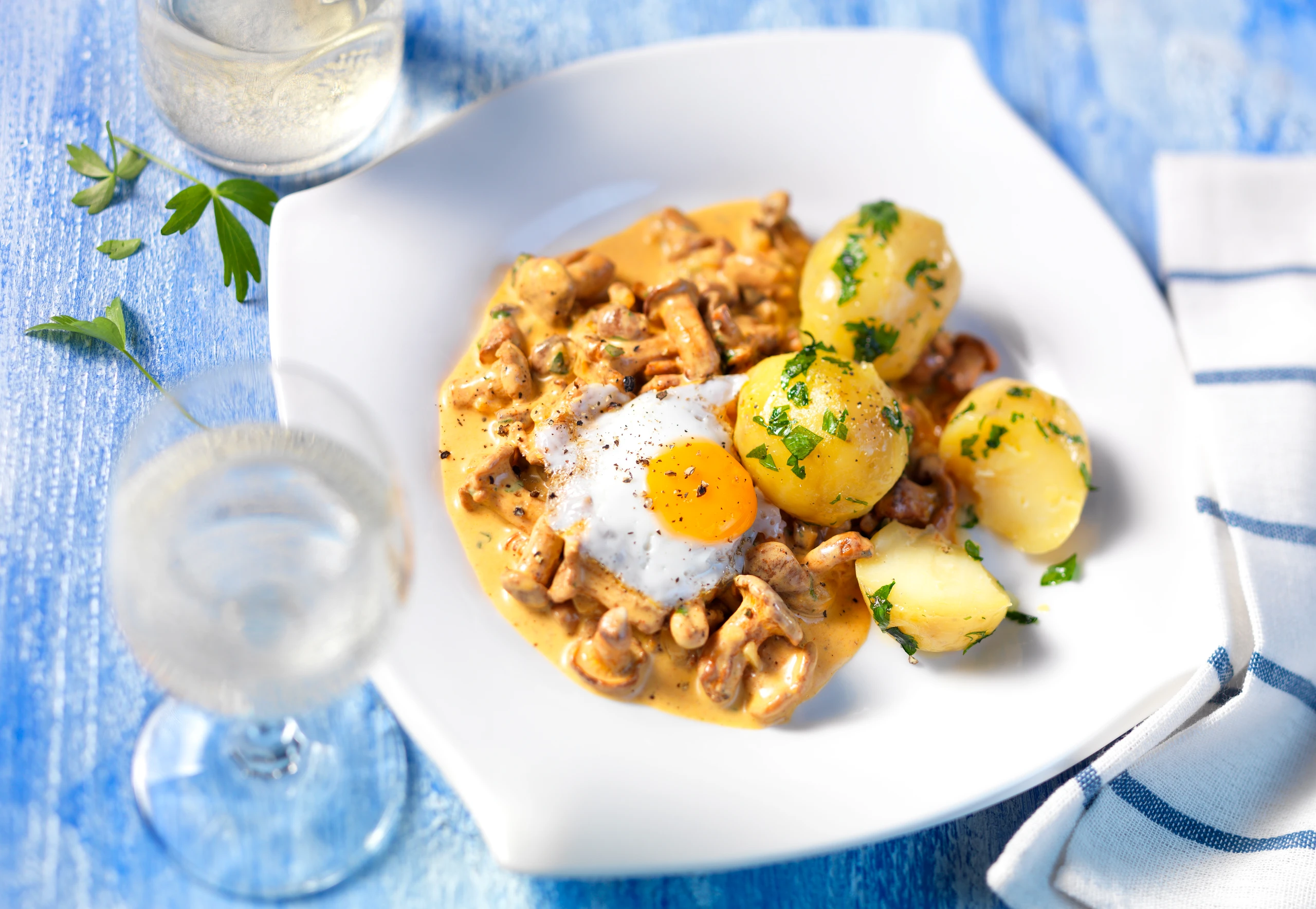 - Für die Spielgeleier in einer beschichtete Pfanne restliches Öl erhitzen. Eier vorsichtig in die Pfanne schlagen und bei schwacher Hitze braten. Das Schwammerlgulasch mit Spiegeleiern und geröstetem Schwarzbrot anrichten.