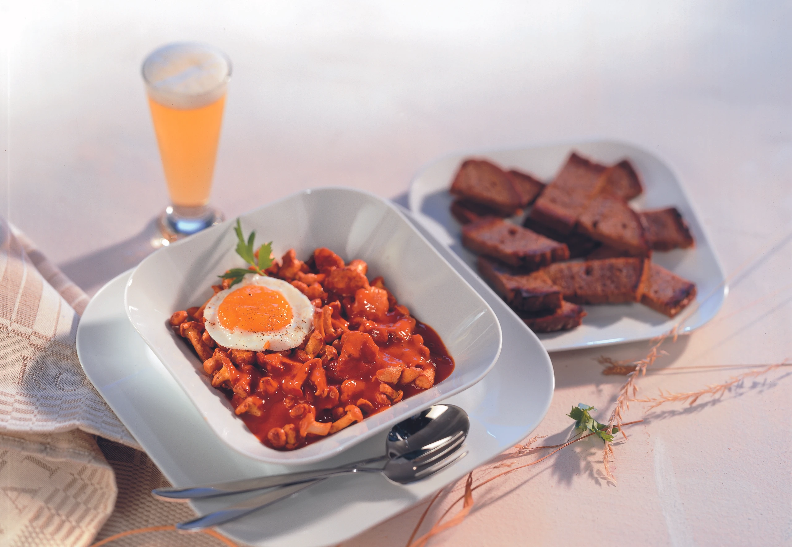 Schwammerlgulasch mit Spiegelei und Schwarzbrot-Toasts