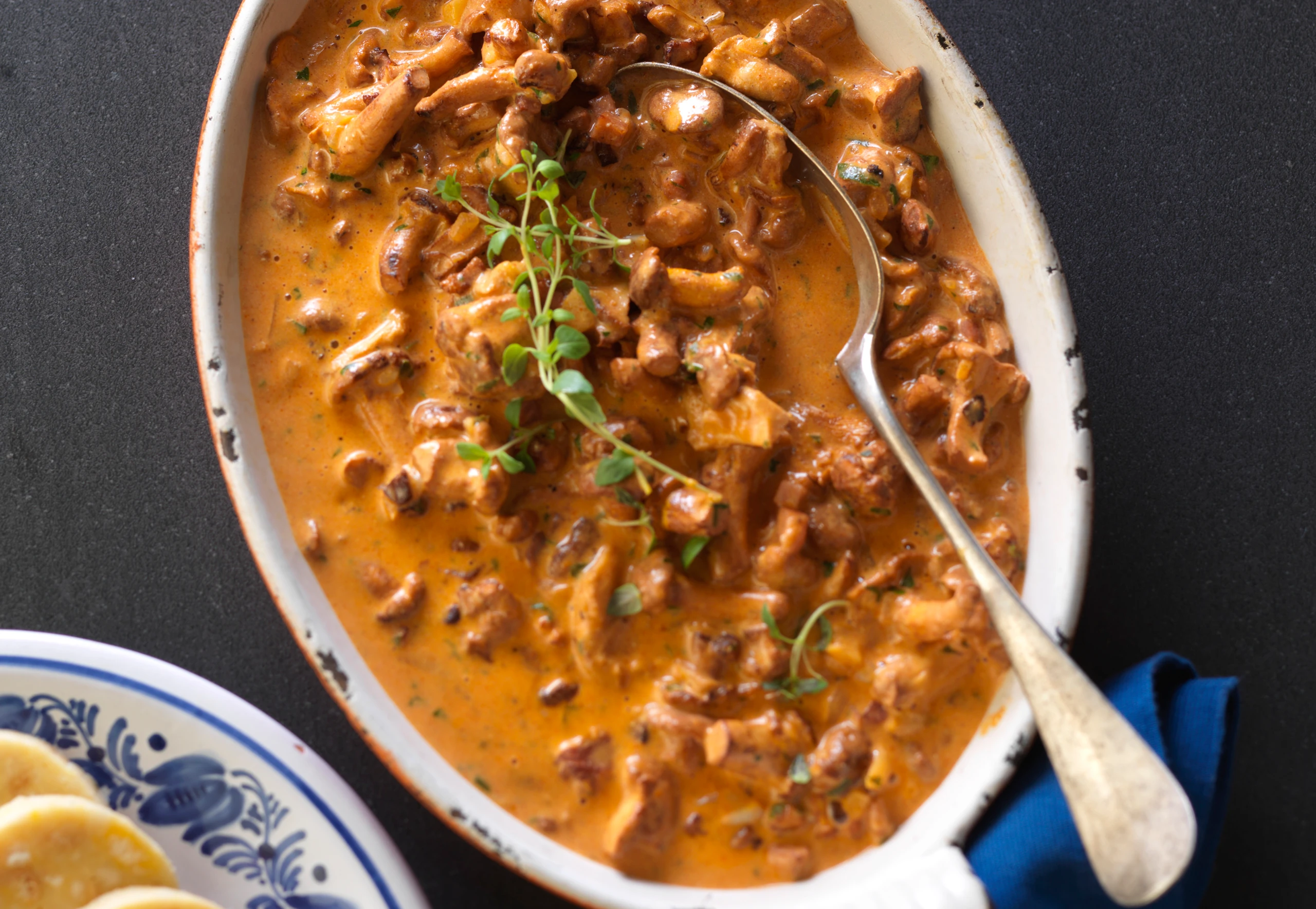 Schwammerln putzen und halbieren oder vierteln. Schwammerln in 1 EL Öl rösten, bis die austretende Flüssigkeit verdampft ist. Paprikasauce unterrühren und aufkochen. Rahm mit 1 EL Mehl verquirlen, in das Gulasch rühren und ca. 1 Minute köcheln. Majoran einrühren.