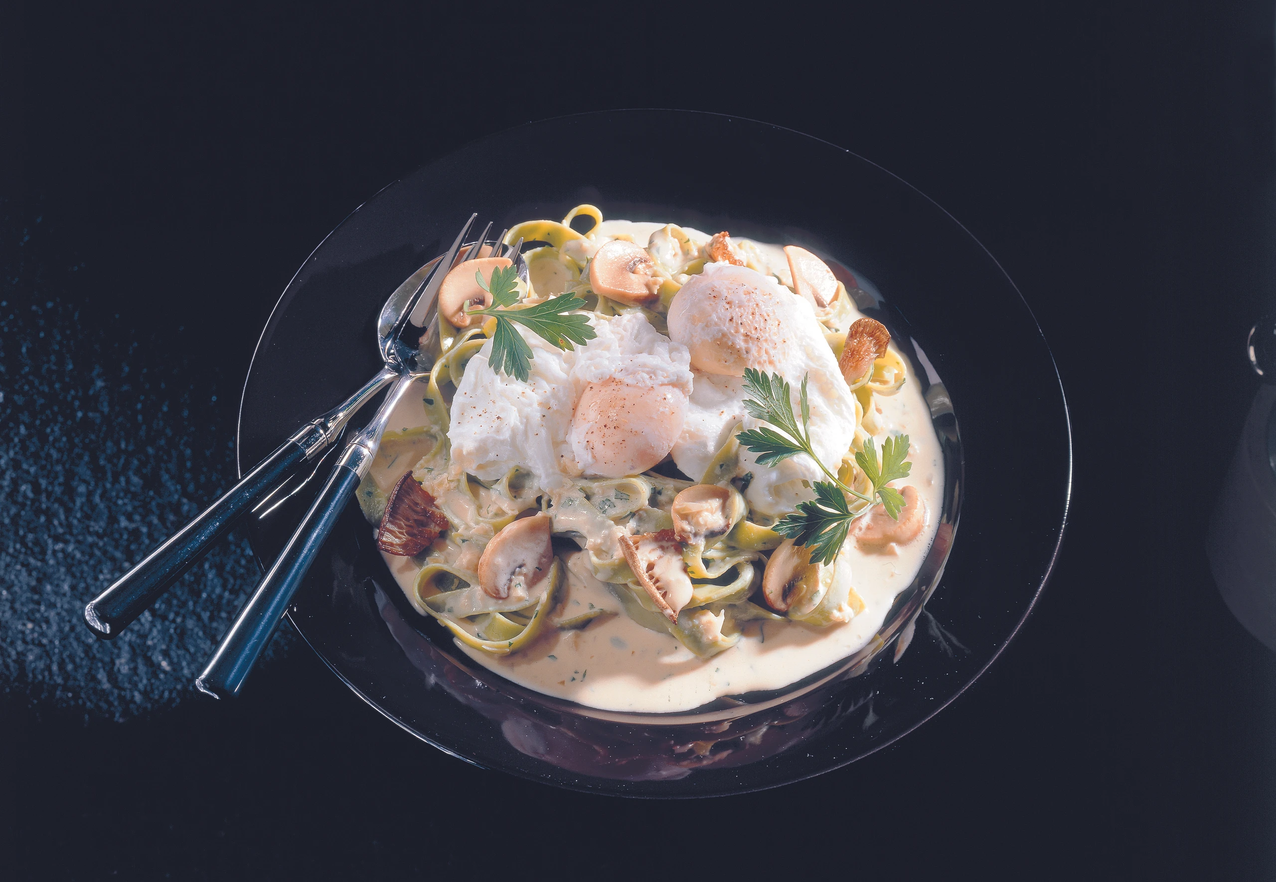 - Die Nudeln mit der Schwammerlsauce anrichten. Eier mit einem Siebschöpfer aus dem Wasser heben und mit den Nudeln servieren.