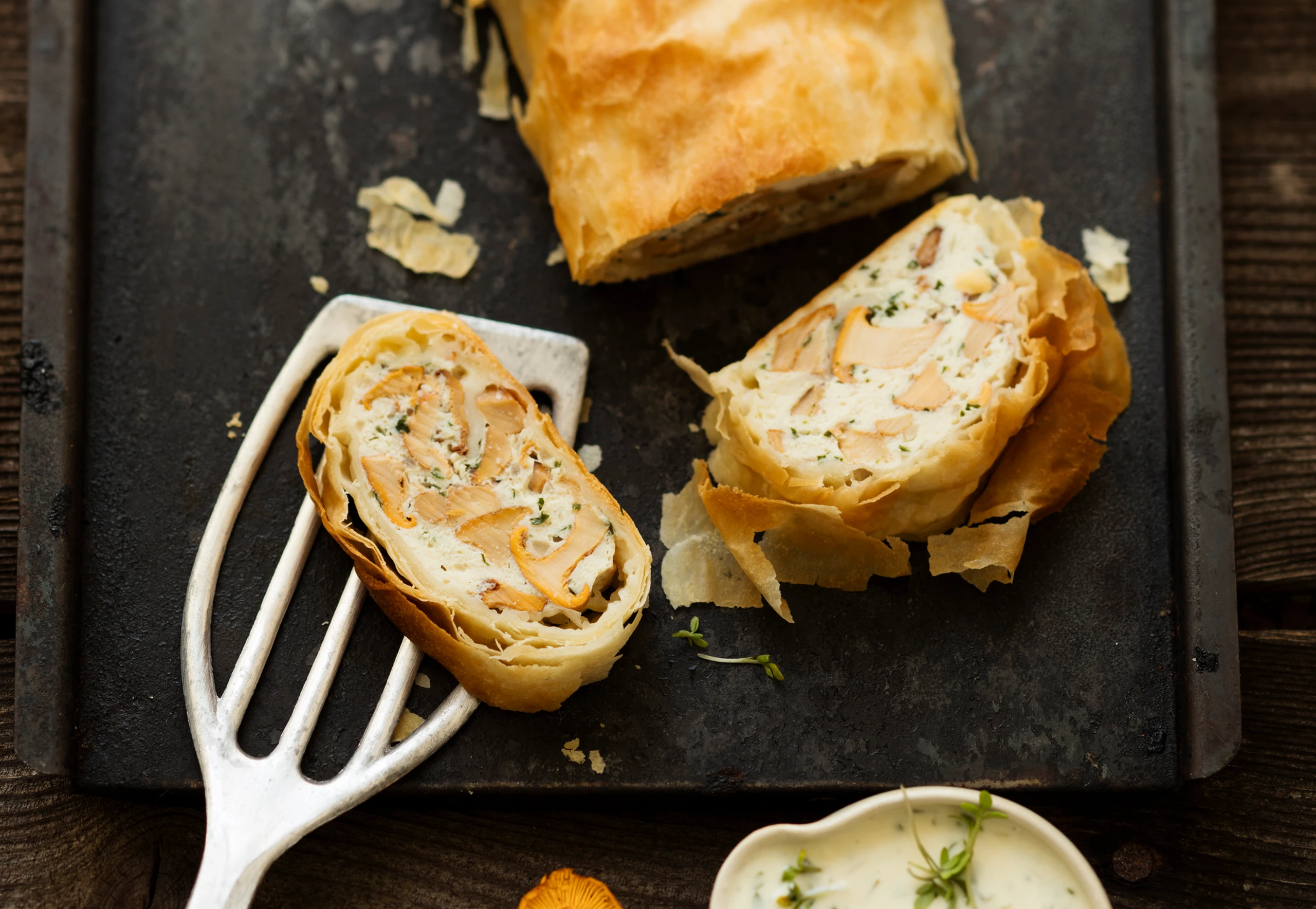 Huhn-Schwammerlstrudel mit Kräutersauce