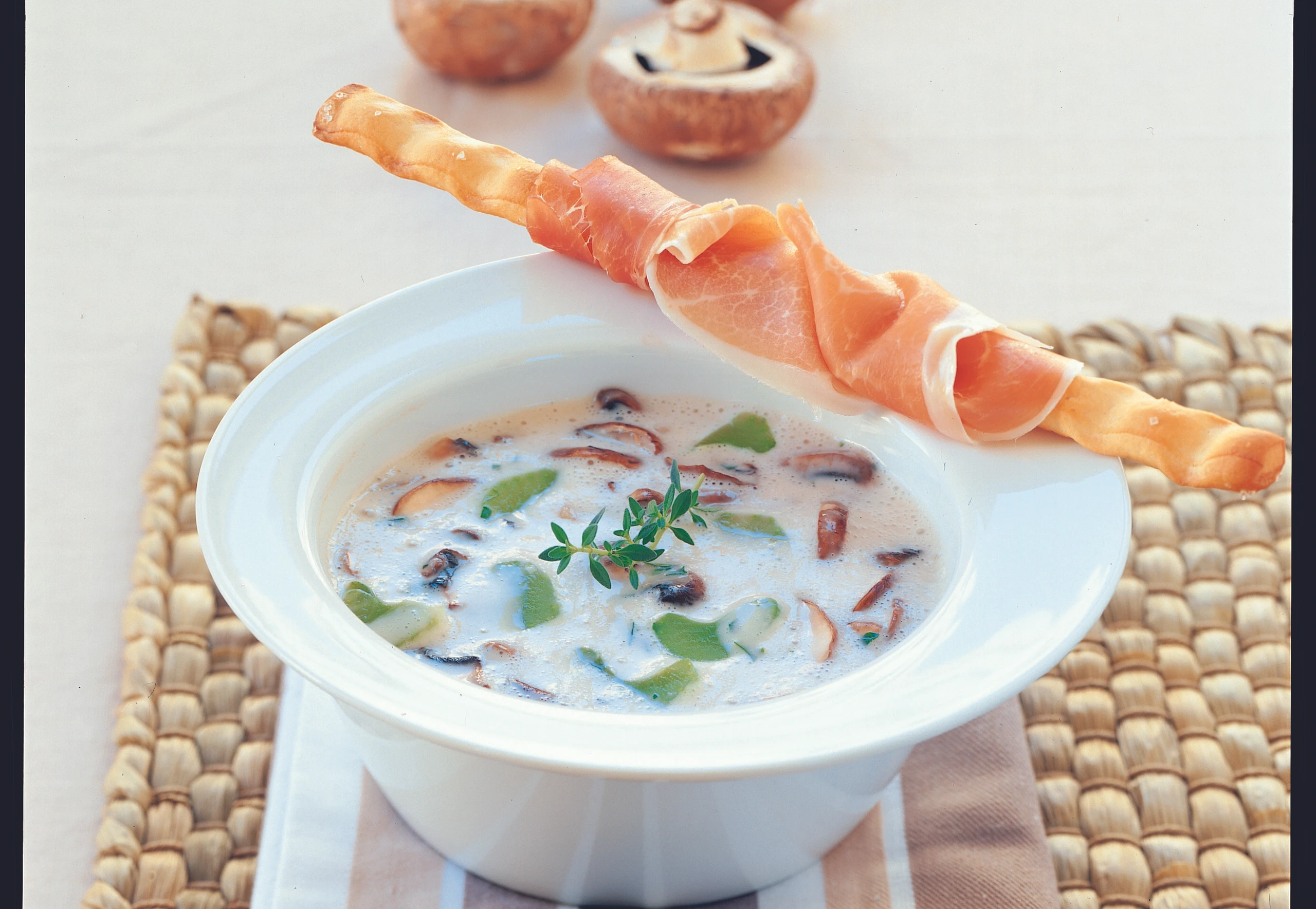 - Grissini mit Schinken umwickeln. Suppe mit den Grissini servieren.