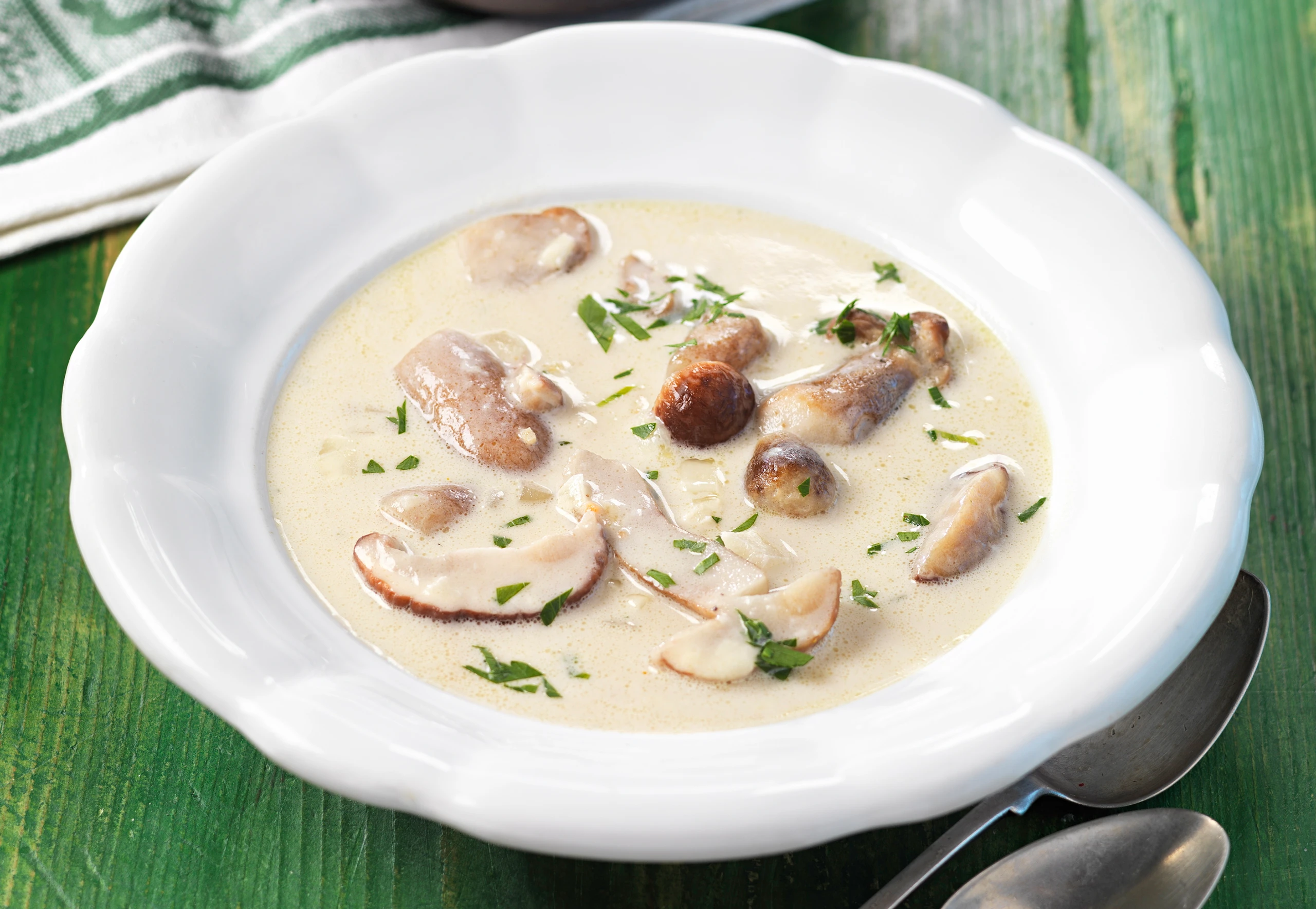 - Pilze gründlich putzen und dickblättrig schneiden. Zwiebel und Knoblauch schälen, fein hacken und in Butter hell anschwitzen. Mit Mehl stauben, bei schwacher Hitze hell rösten, mit Suppe aufgießen und aufkochen. Suppe versprudeln, Pilze hineingeben und 4 Minuten köcheln.