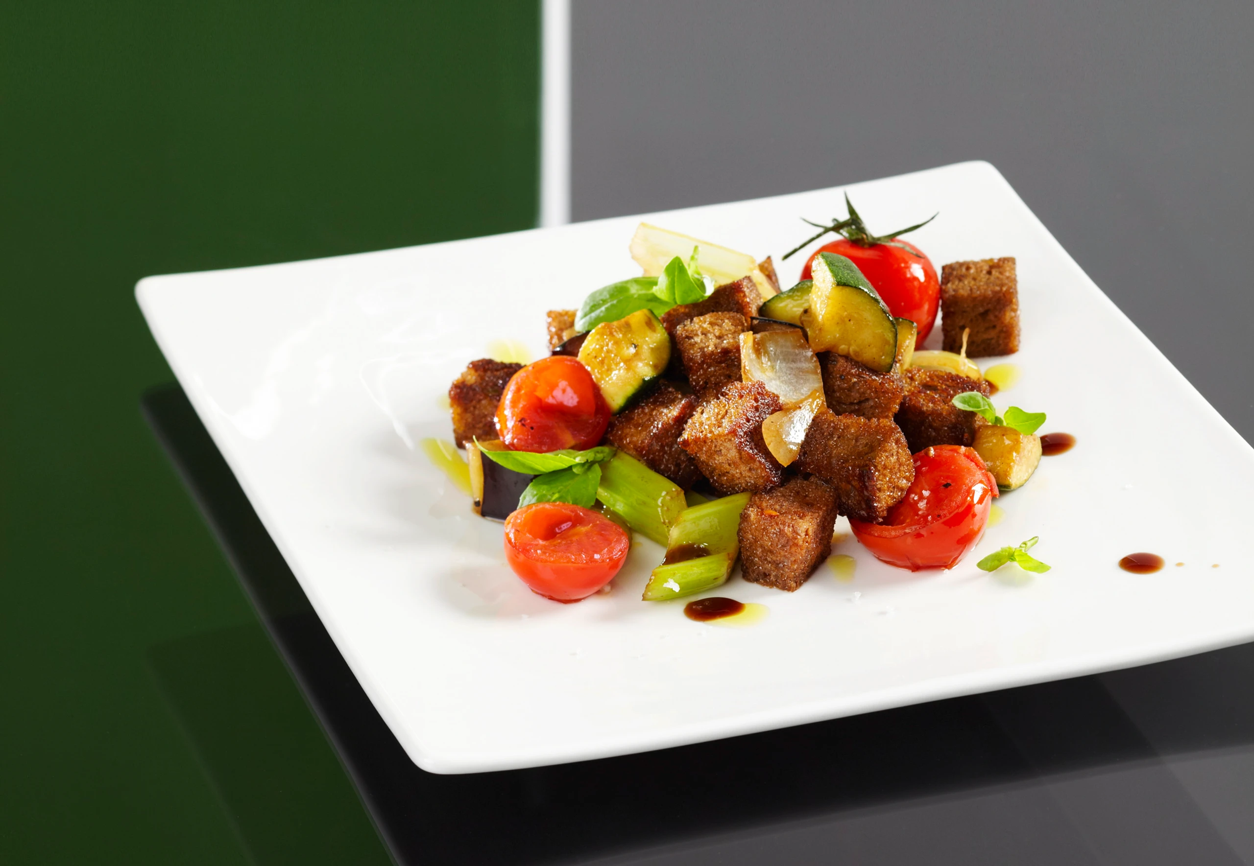 In einer beschichteten Pfanne 1 EL Öl erhitzen und die Brotstücke darin rundum rösten. Herausnehmen und beiseite stellen. Pfanne säubern. Gemüse in 2 EL Öl anbraten, salzen und pfeffern. Brotstücke, Gemüse und Marinade vermischen. Salat anrichten und mit Basilikum garniert servieren.