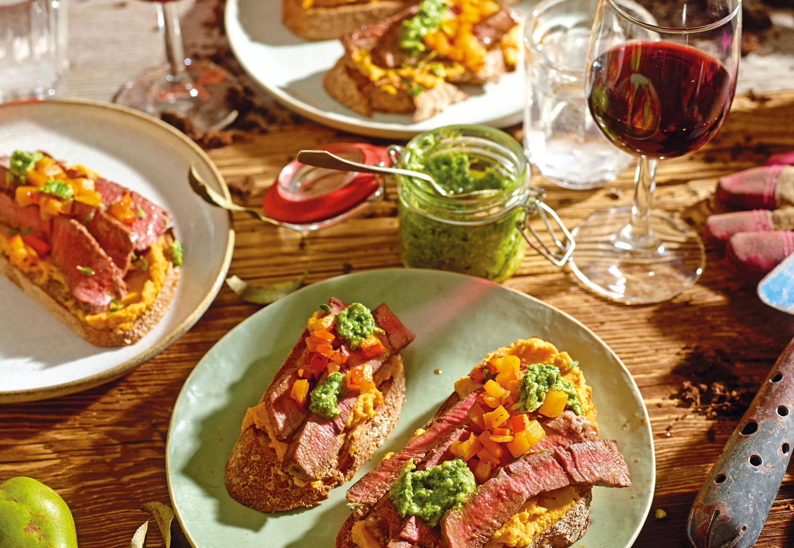 Schwarzbrottoasts mit Kürbishummus, Tagliata und Vogerlsalat-Pesto