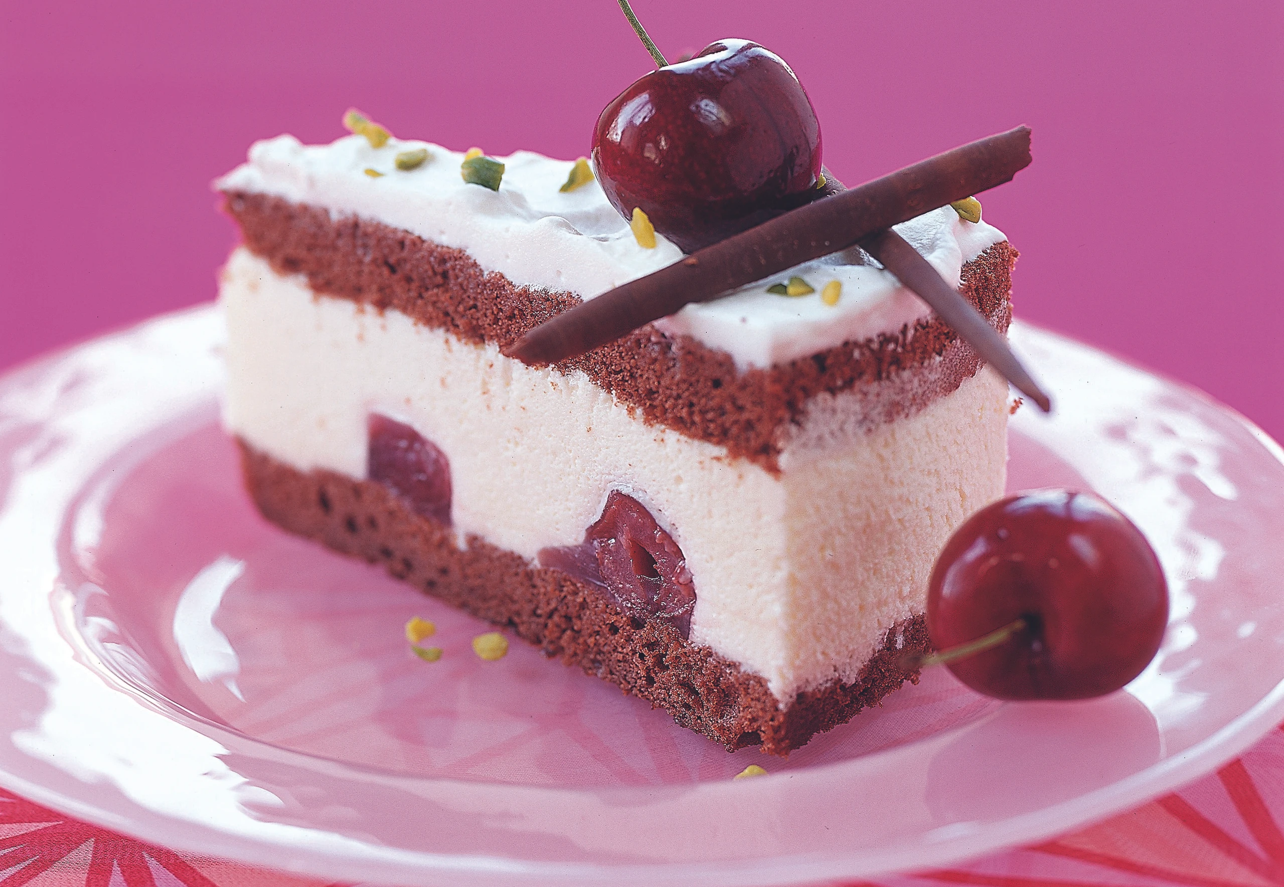 - Für die Garnitur Obers cremig schlagen, Kirschwasser einrühren. Torte mit Kirschobers einstreichen, mit Kirschen, Pistazien und Schokoröllchen (siehe Tipp) garnieren.
