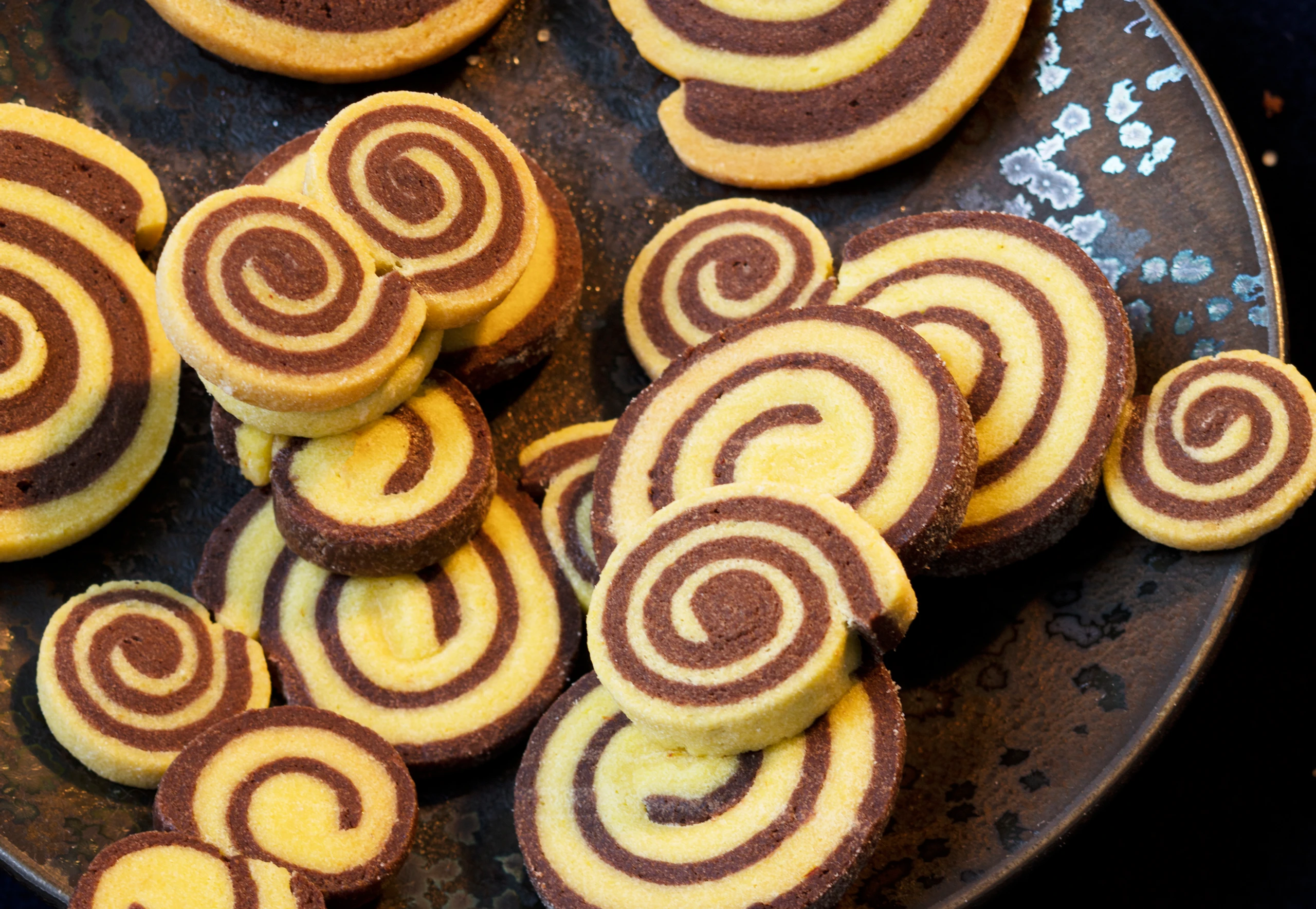 Teige separat auf einer bemehlten Arbeitsfläche ca. 3 mm dick ausrollen, dünn mit Eiklar bestreichen und übereinander legen. Zu verschieden dicken Rouladen aufrollen. Rouladen für ca. 1 Stunde kalt stellen.