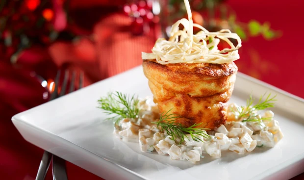 Aufläufe auf Teller stürzen, mit Quittensalat anrichten und mit Schwarzwurzelstreifen und Dille garniert servieren.