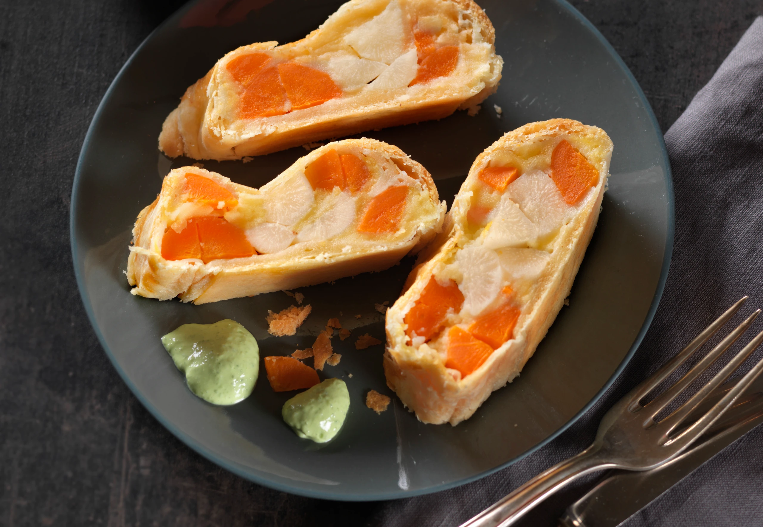 Teig halbieren. Eine Hälfte auf einer bemehlten Arbeitsfläche 0,5 cm dick ausrollen. Am unteren Teigrand eine Viertel von der Erdäpfelmasse auftragen, die Hälfte von den Gemüsestücken in die Masse drücken und mit einem weiteren Viertel der Erdäpfelmasse bestreichen. Teig über die Fülle einrollen. Aus den übrigen Zutaten einen zweiten Strudel herstellen. Strudel auf das Backblech geben, mit Ei bestreichen und im Rohr (mittlere Schiene) ca. 30 Minuten backen.