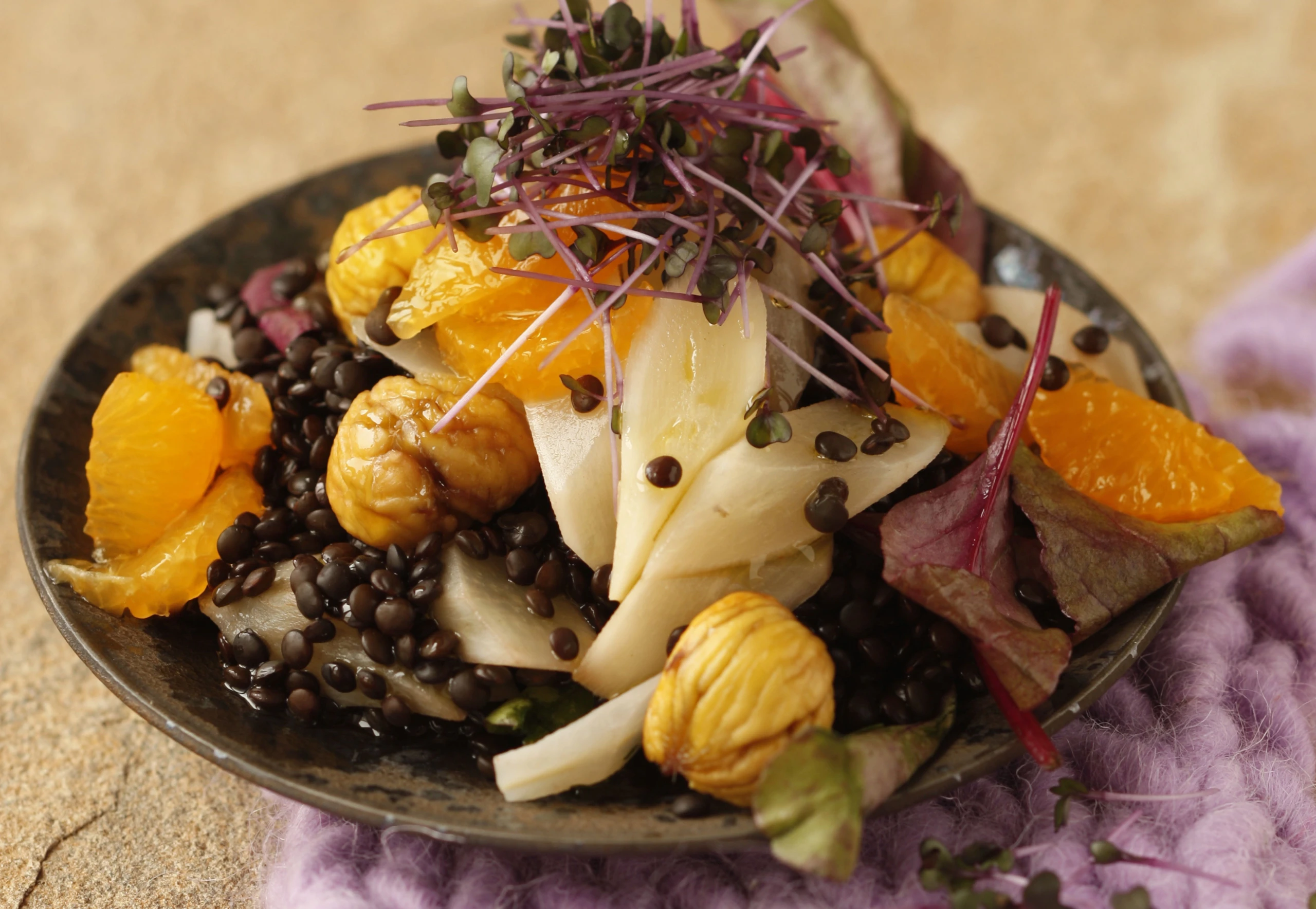Schwarzwurzel-Linsen-Salat mit Maroni und Mandarinen