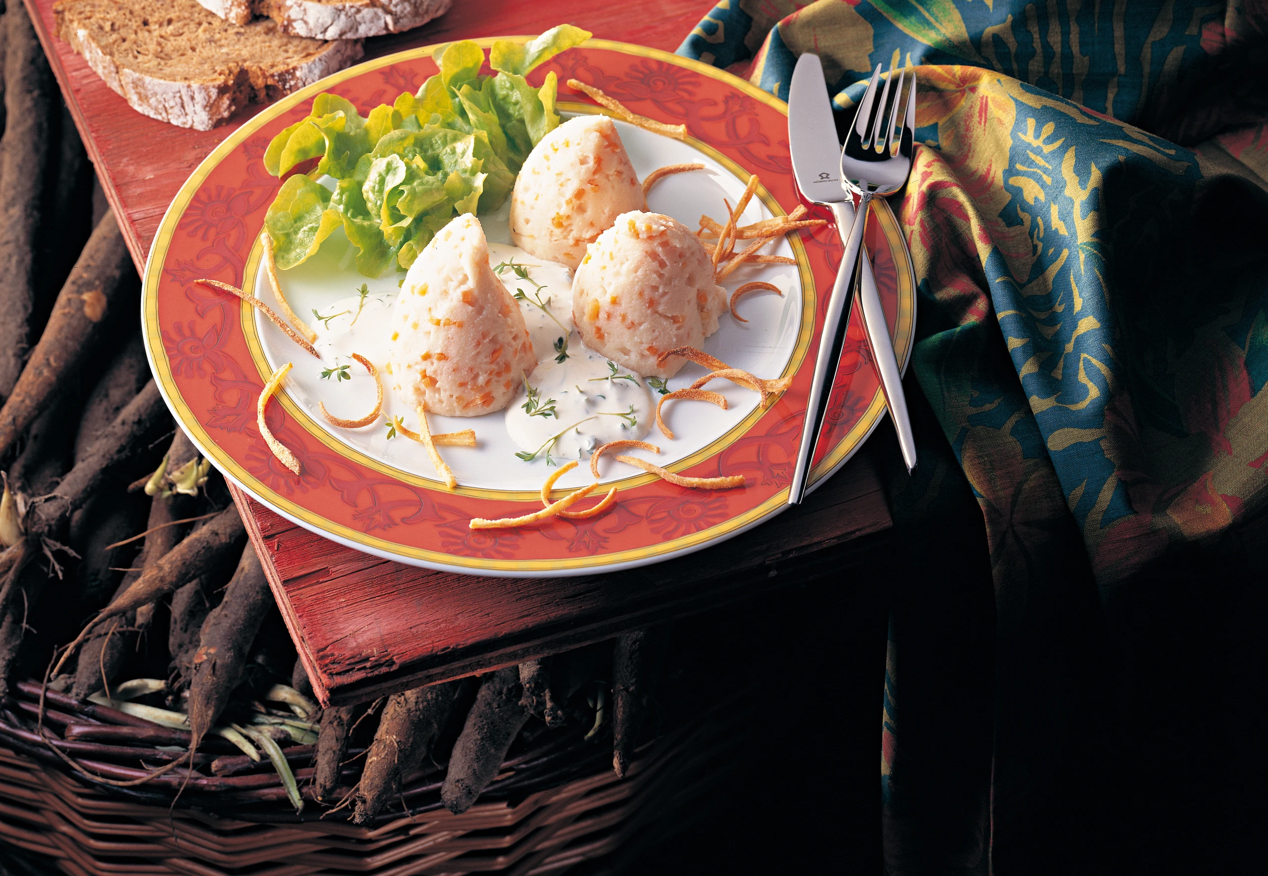 Aus dem Mus gleichgroße Nocken stechen (gelingt am besten, wenn man den Löffel zwischendurch immer wieder in heißes Wasser taucht). Nocken auf Tellern anrichten.