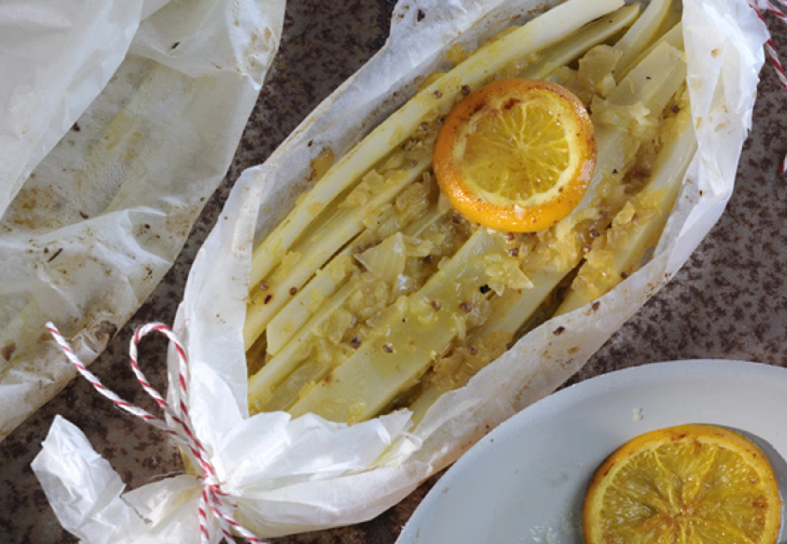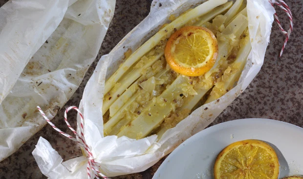- Vier Stück Backpapier (38 x 42 cm) vorbereiten. In die Mitte jeweils ein Viertel der Schwarzwurzeln legen, Sauce und Butter darauf verteilen. Backpapier längs zusammenfalten, Enden mit einem Küchengarn zusammenbinden. Schwarzwurzelpäckchen auf das Backblech legen und im Rohr (mittlere Schiene) ca. 30 Minuten garen.