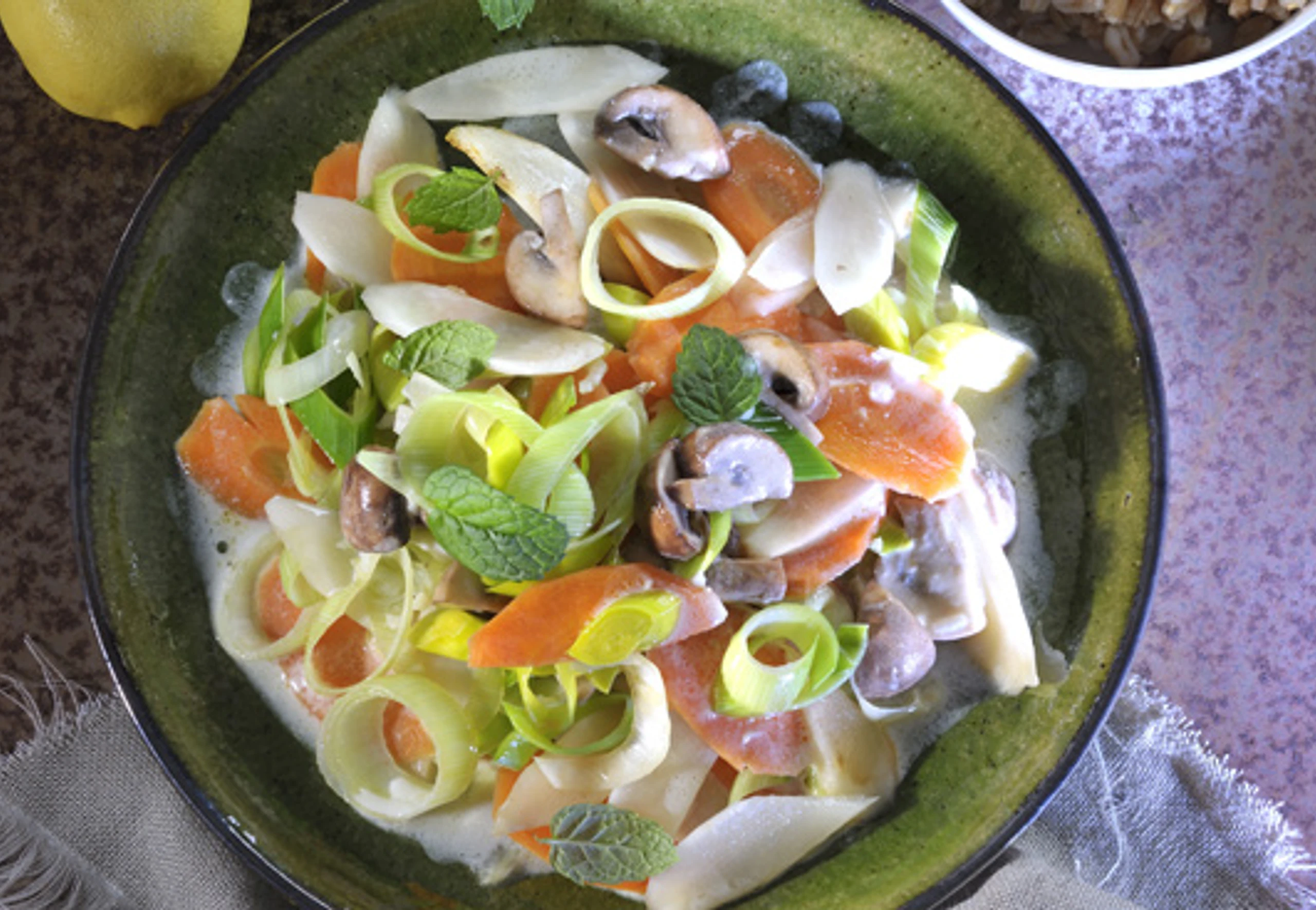 Gemüse mit der Sauce anrichten, eventuell mit Minze garnieren. Dazu passt Dinkelreis.
