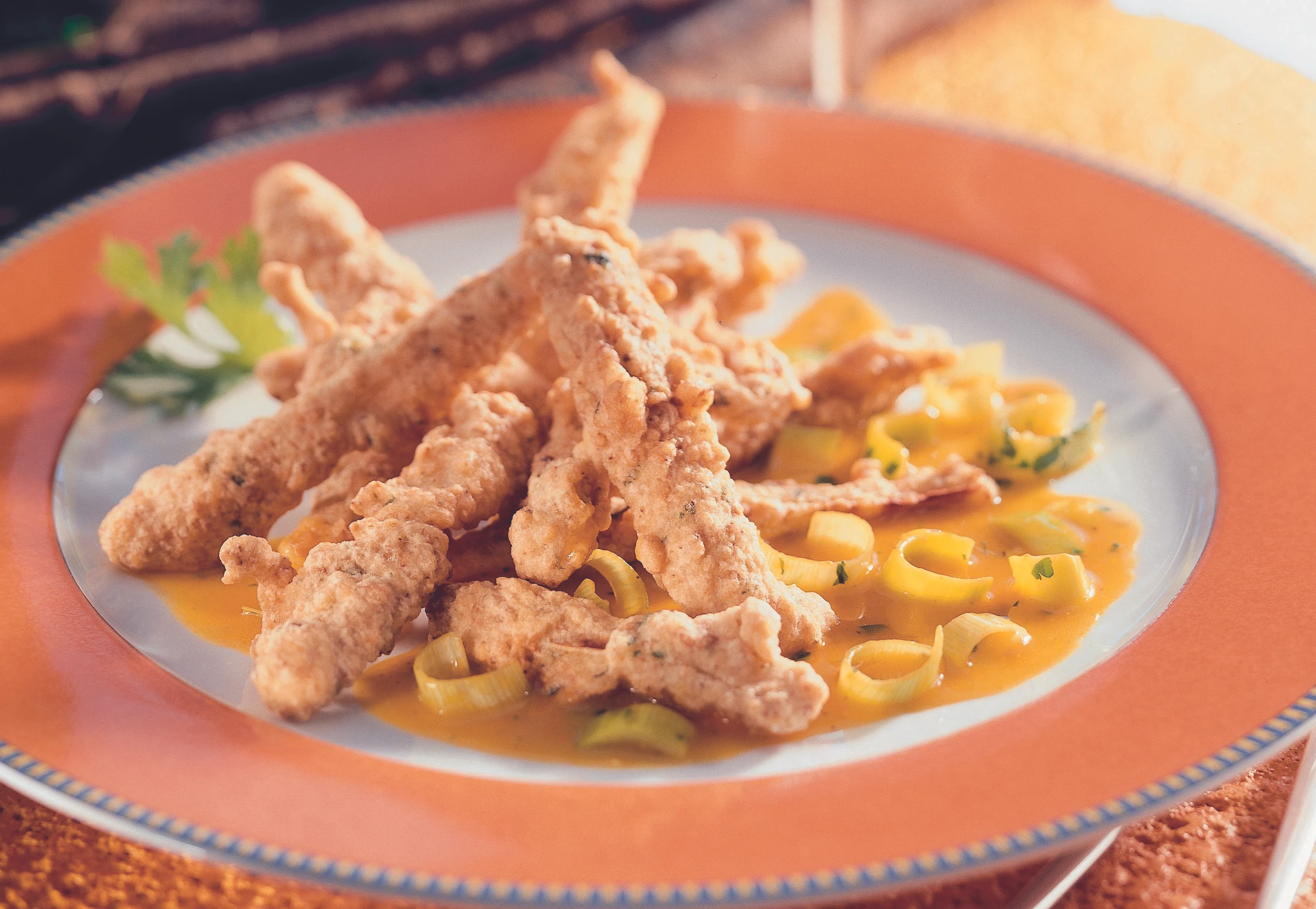 Lauch und Ingwer in Butter hell anschwitzen, Curry einrühren und kurz rösten. Suppe und Karottensaft zugießen und aufkochen. Stärke mit 2 TL kaltem Wasser verrühren, in die Sauce gießen und bei schwacher Hitze ca. 1/2 Minuten köcheln. Sauce salzen und pfeffern. Petersil einrühren.