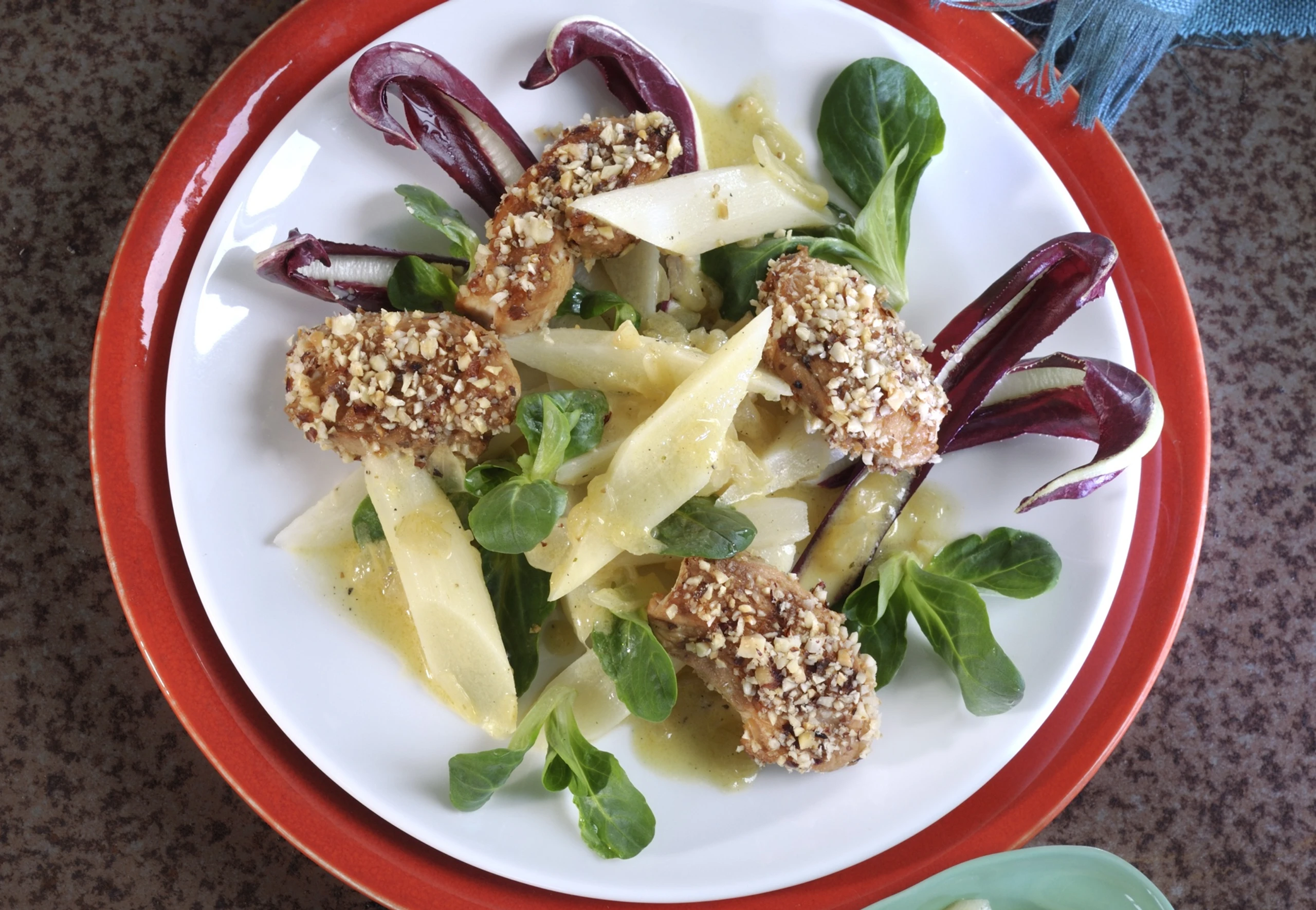 - Hühnerstreifen in den gerösteten Nüssen wenden und mit dem Schwarzwurzelsalat servieren.