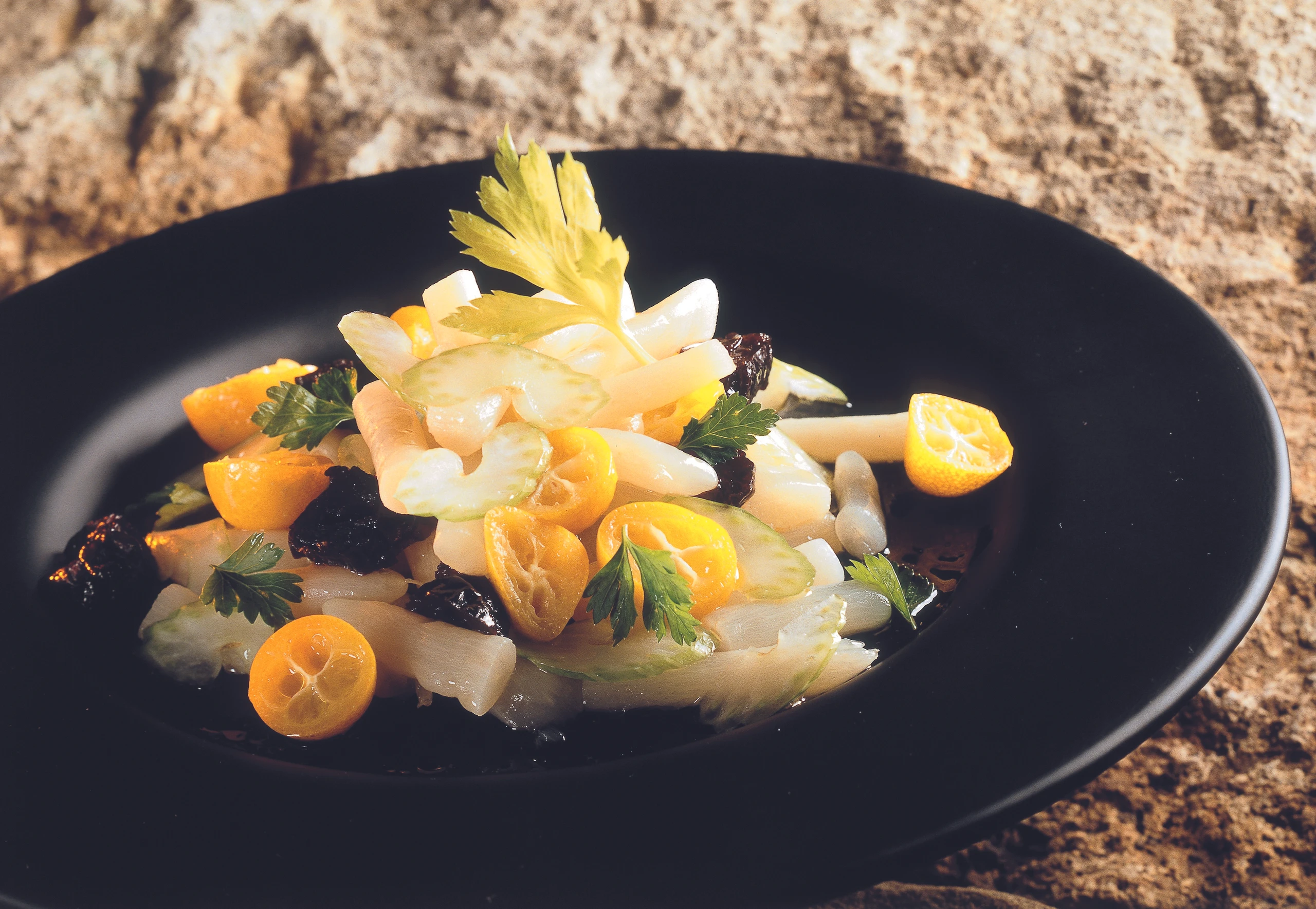 Sellerie putzen (Grün für die Garnitur reservieren), schälen und in dünne Scheiben schneiden. Zwergorangen in leicht gesalzenem Wasser überkochen, abseihen, abschrecken und gut abtropfen lassen. Früchte quer halbieren und die Kerne entfernen. Dörrzwetschken in dünne Scheiben schneiden.