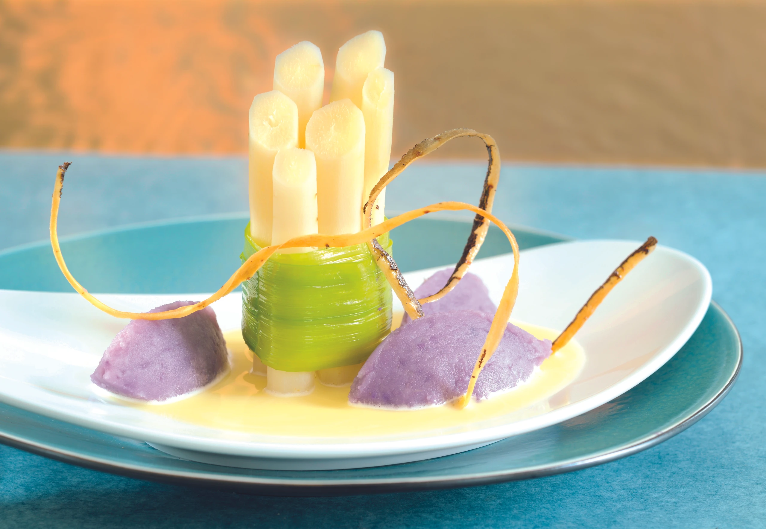 Je ca. 6 Schwarzwurzeln mit dem Lauch umwickeln. Päckchen erwärmen, mit Püree, Sauce und knusprigen Schalen anrichten.