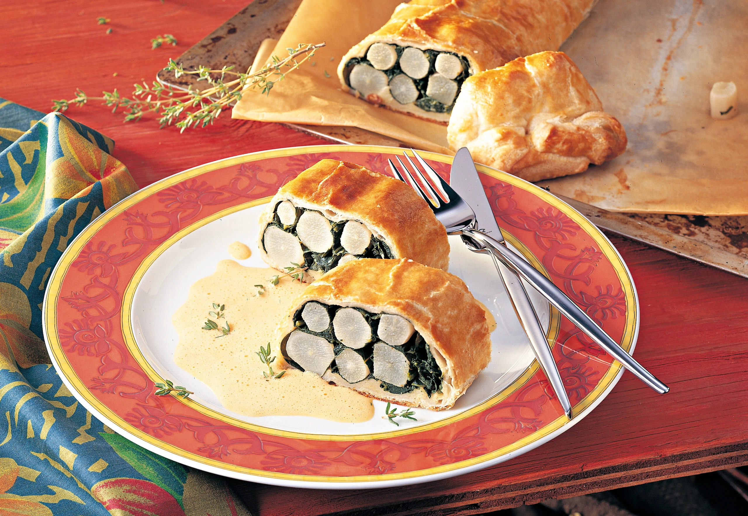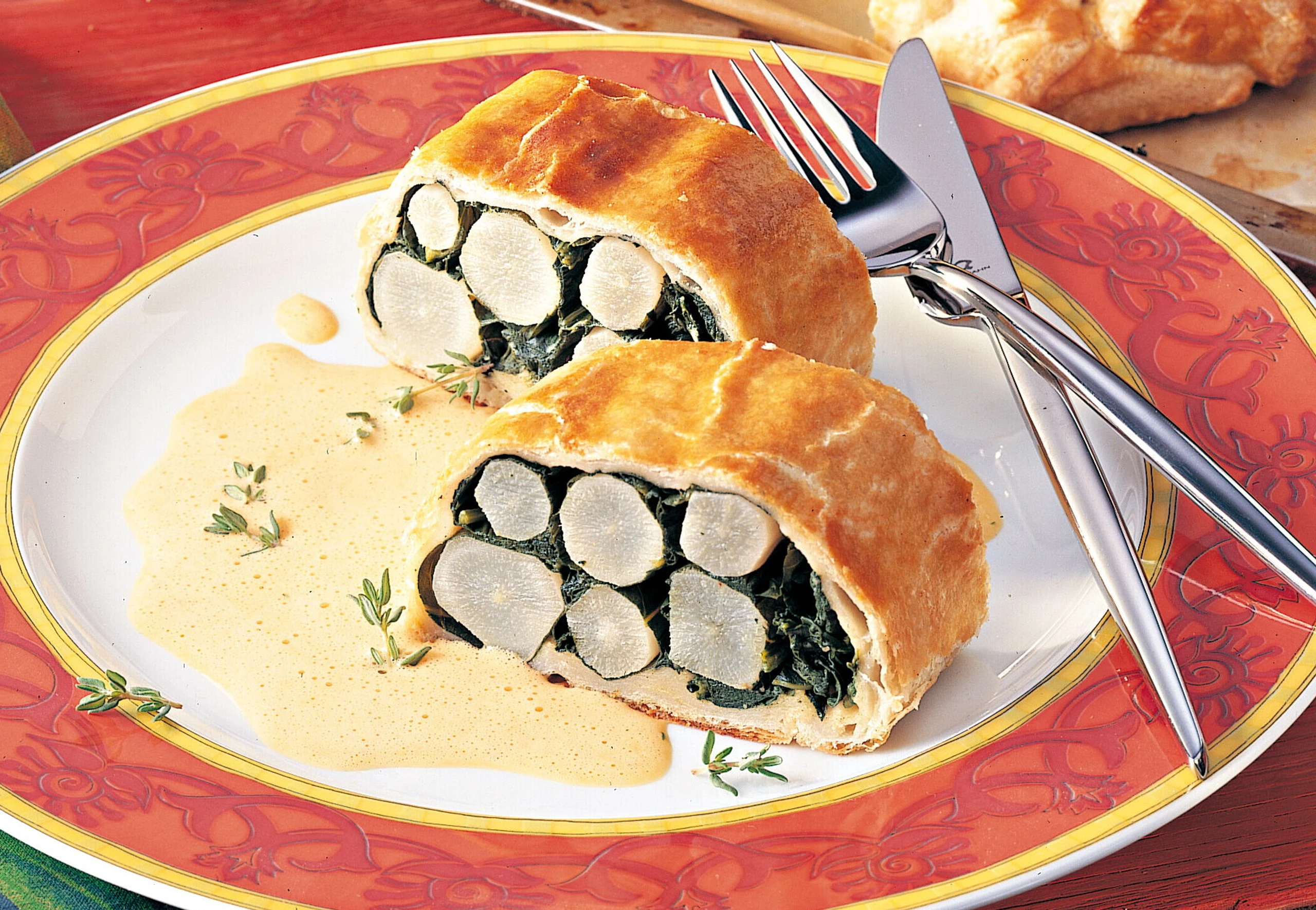 Backrohr auf 200 °C Ober-/Unterhitze vorheizen. Backblech herrichten. Blätterteig aufrollen. Unteres Teigdrittel mit Schwarzwurzeln und Spinat belegen, restlichen Teig mit Ei bestreichen und von unten nach oben straff einrollen. Teigenden zusammendrücken.