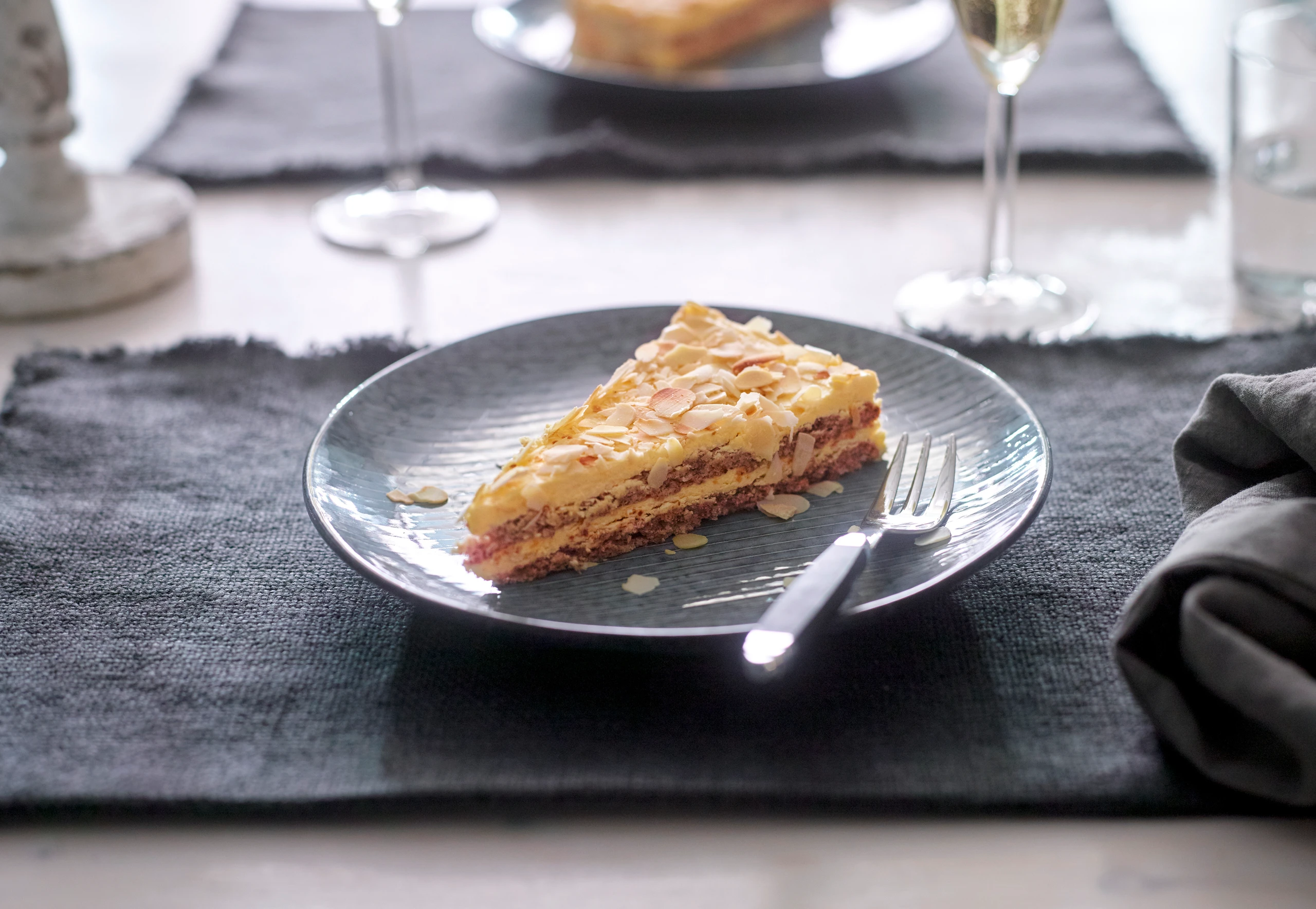 Einen Boden mit der Hälfte von der Creme bestreichen, den zweiten Boden daraufsetzen und behutsam andrücken. Torte mit übriger Creme rundum einstreichen, mit gehobelten Mandeln einstreuen und für ca. 2 Stunden kühl stellen.