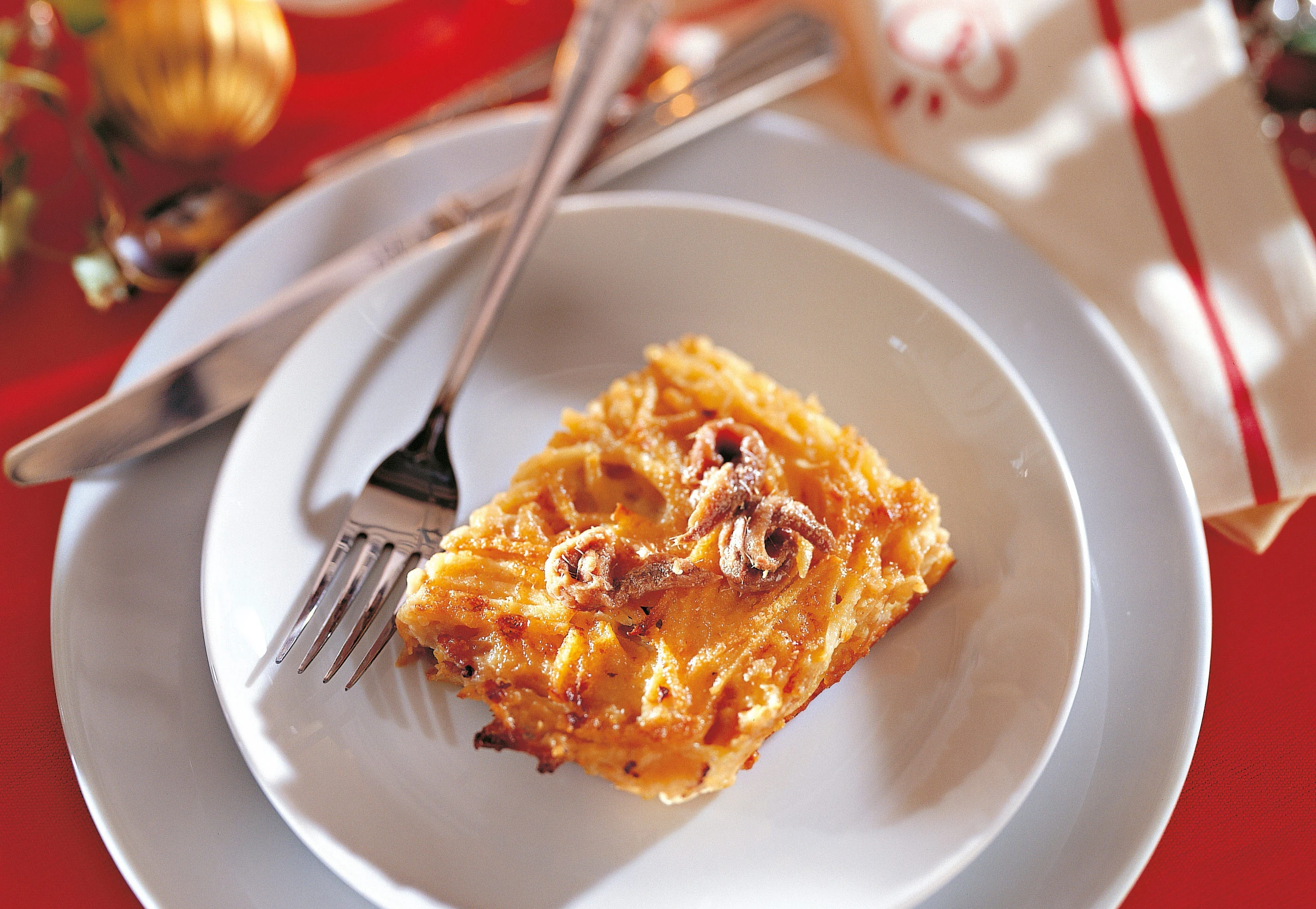Eine ofenfeste Form mit Butter ausstreichen und mit Bröseln aus-streuen. Rohr auf 180°C vorheizen. Anchovis in einem Sieb abtropfen lassen, Fond auffangen. Erdäpfel schälen und in Streifen schneiden (hobeln). Die Hälfte davon in der Form verteilen, dann Zwiebeln, Anchovisfilets und restliche Erdäpfel darauf geben. Masse ein wenig flach drücken.