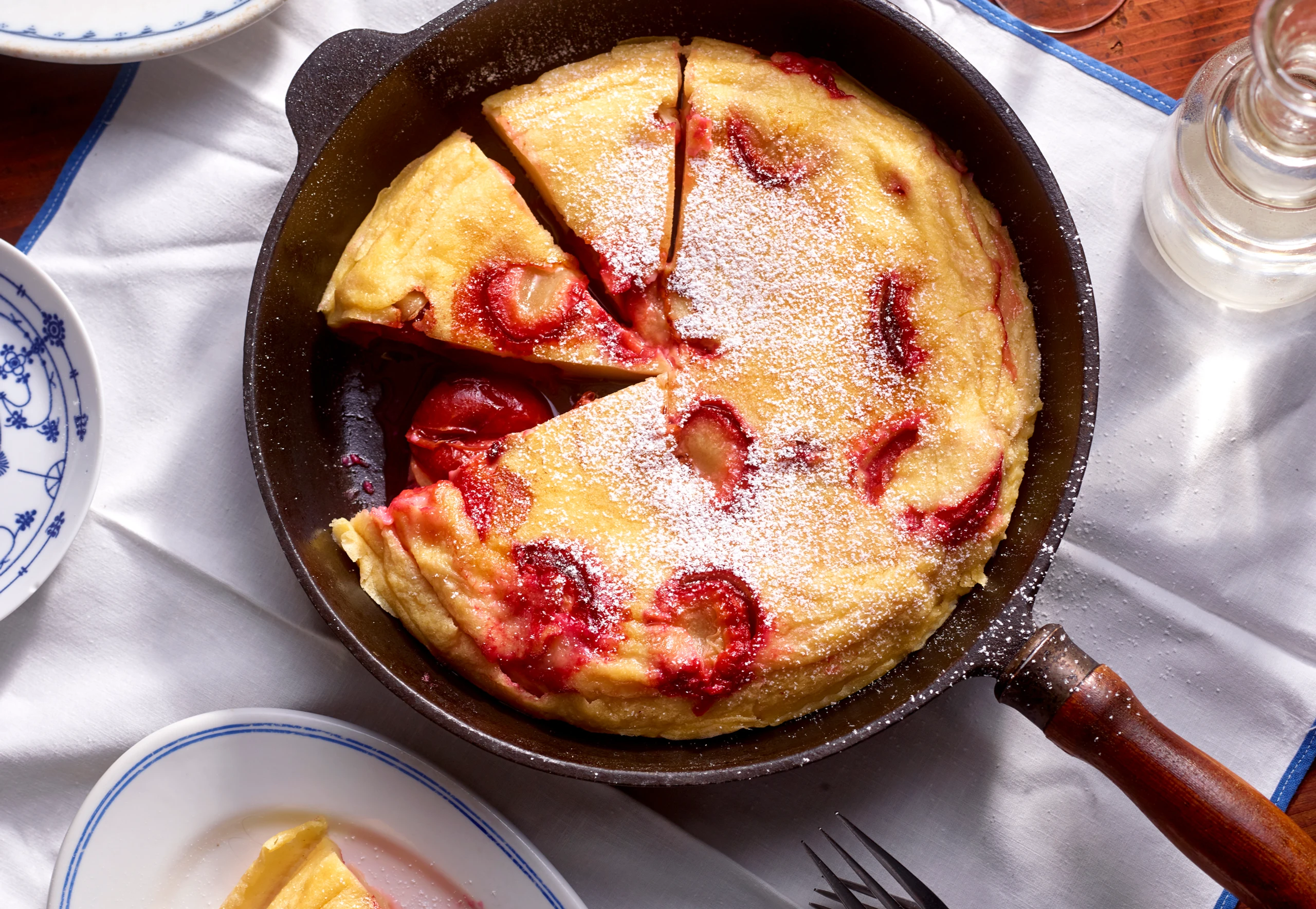 Mehl, Eier, Milch und 1 Prise Salz glatt rühren. Zwetschken halbieren, entsteinen und vierteln. Butterschmalz in einer Pfanne (Ø 26 cm) erhitzen und die Zwetschken kurz anbraten.