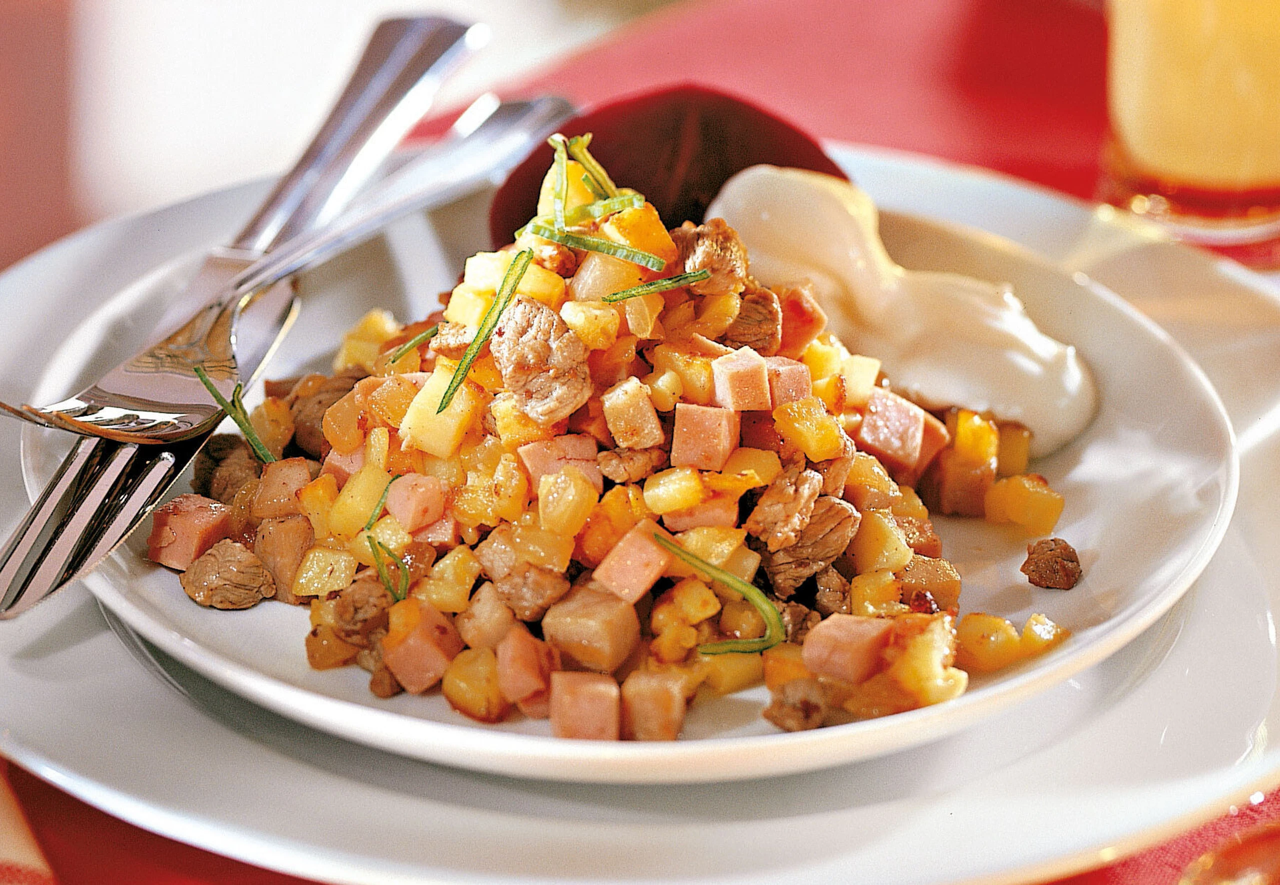 Erdäpfel bei guter Hitze in 1 EL vom Öl goldgelb braten, bis sie gar sind. Zwiebel zugeben und glasig dünsten. Fleischsorten und Wurst getrennt in Öl anrösten. Erdäpfel, Fleisch und Wurst mit der Butter vermischen, salzen und pfeffern.