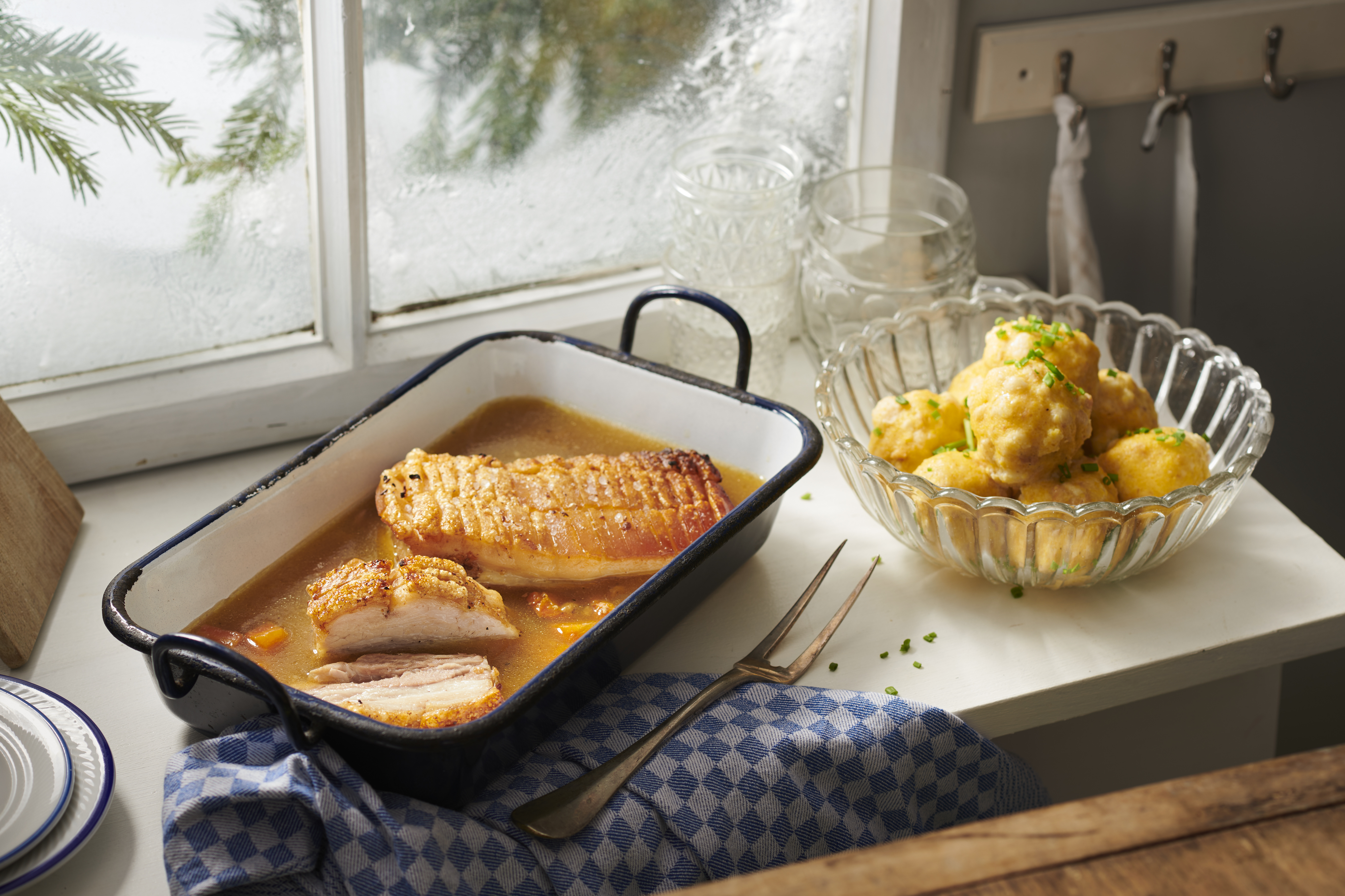 Knödel aus dem Kochwasser heben und abtropfen lassen. Fleisch portionieren mit Saft und Knödeln anrichten. Knödel mit Schnittlauch bestreuen.