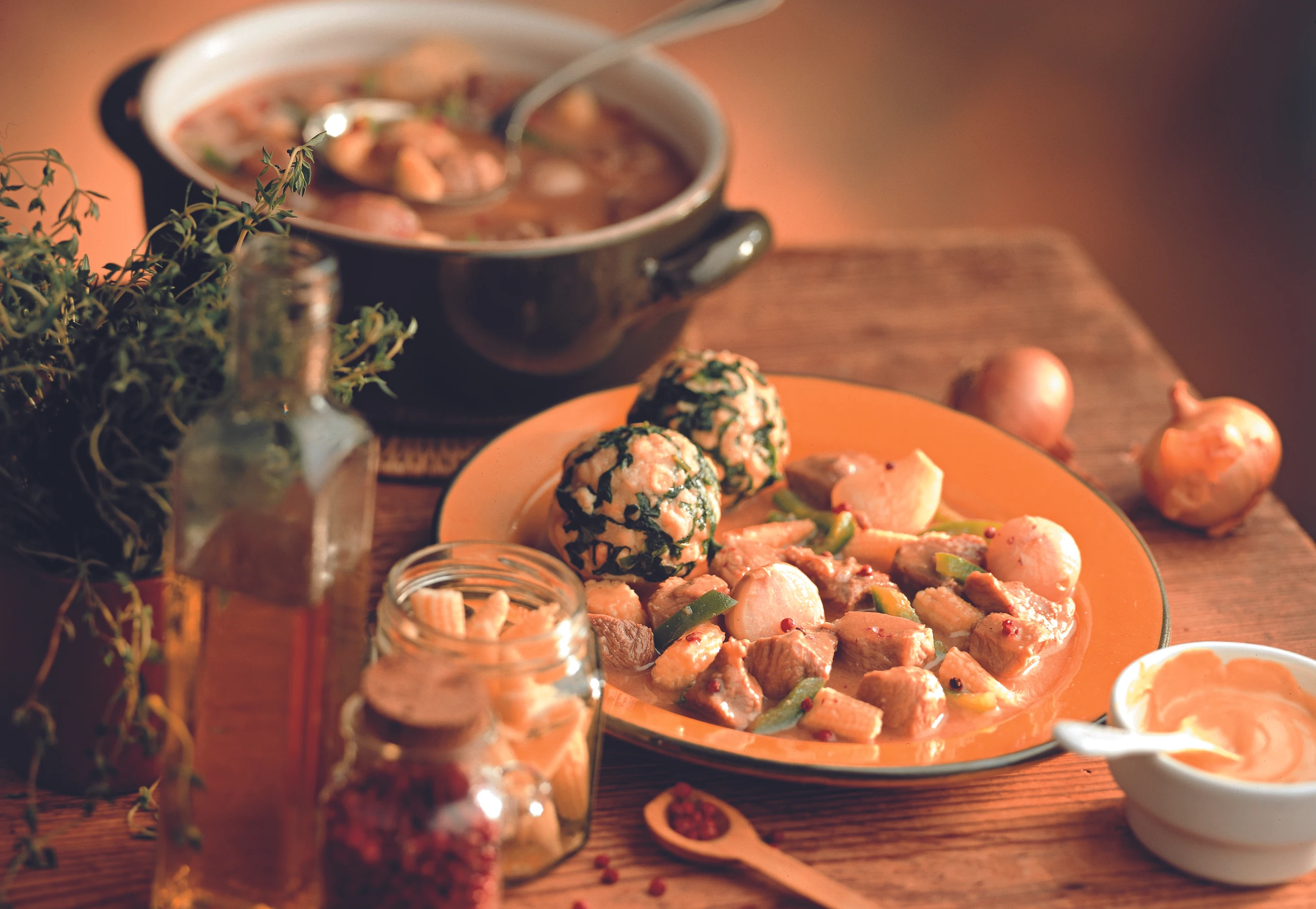Maiskölbchen auf einem Sieb gut abtropfen lassen. Paprika halbieren, putzen und in ca. 1/2 cm breite Stücke schneiden. Gemüse nach ca. 35 Minuten Garzeit zum Eintopf geben. Eintopf fertigdünsten, zum Schluß Rosa Beeren untermischen.