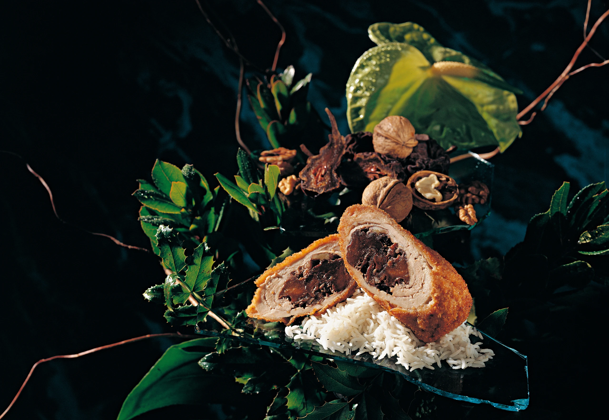 Fleisch zwischen Frischhaltefolie legen, behutsam klopfen und wenig salzen. Fülle an den unteren Rand der Schnitzel geben, die Seiten ein wenig einschlagen. Schnitzel straff über die Fülle einrollen, mit Zahnstochern fixieren und salzen.