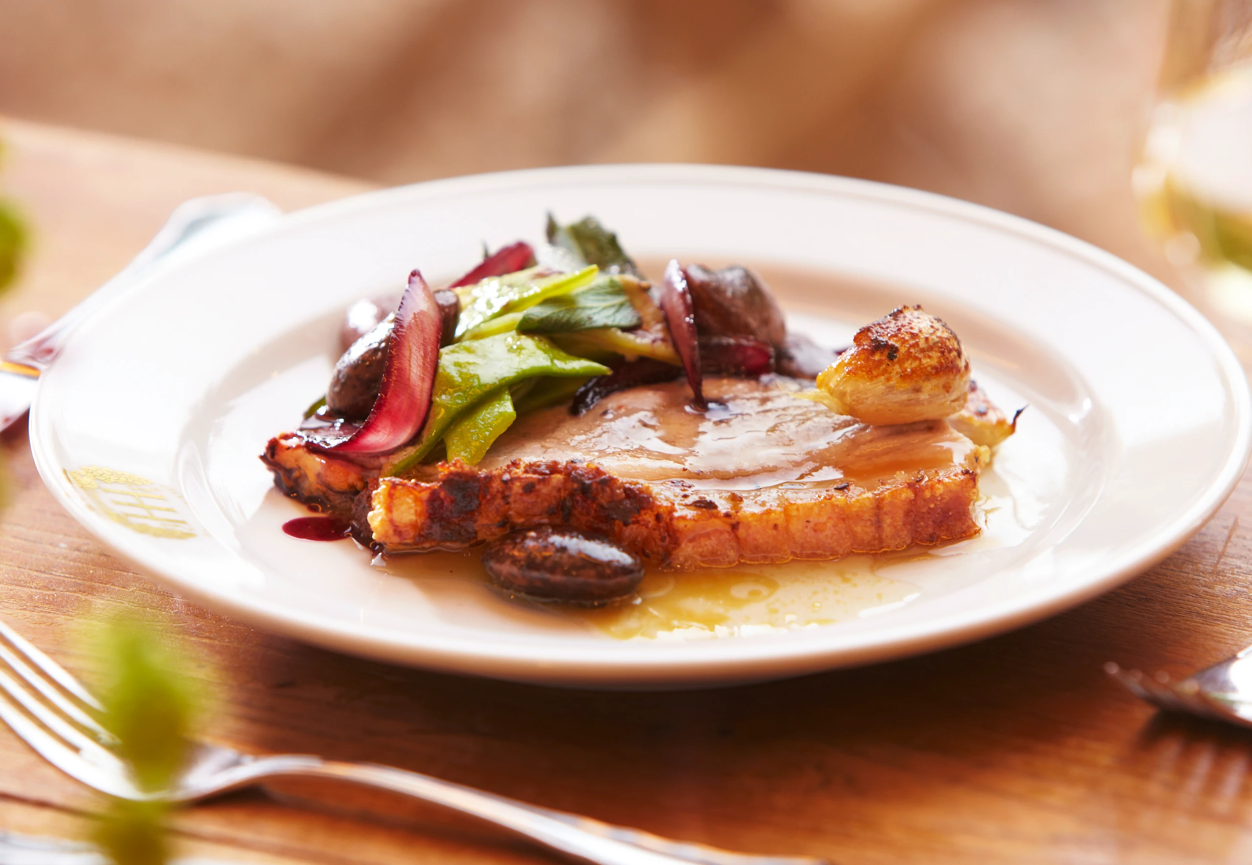 Bratensaft abseihen und einkochen. Rohr auf Grillstellung schalten, Schwarte knusprig backen. Salbei in 1 EL Butter anschwitzen. Käferbohnen und Fisolen darin schwenken, salzen und pfeffern.